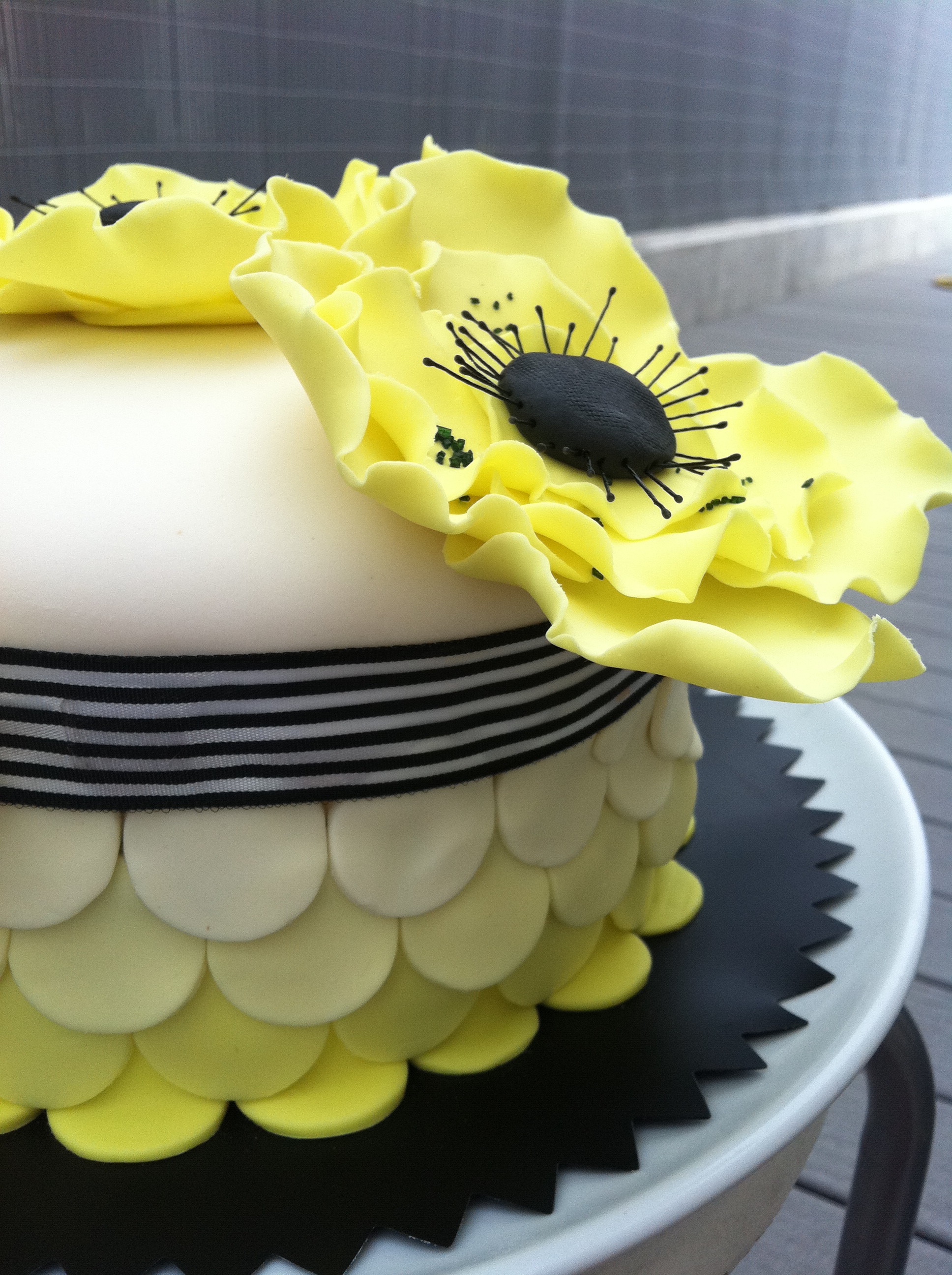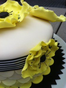 Ya solo queda coronar la tarta con las flores que hayamos hecho, esta vez tres anémonas amarillas que hice también con fondant con un cortador de círculos y añadí al final un poco de azucar negro porque como eran tan grandes veía yo mucho amarillo. Muy, muy fácil también. Las decoraciones siempre hacedlas con uno o dos dias de antelación para que seque bien el fondant. Luego yo las pego con un poco de CMC diluido en agua. Si las flores son pequeñas con mojar el fondant en agua es suficiente pero estás eran bastante grandes y pesabaaan tela.