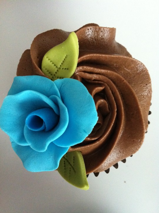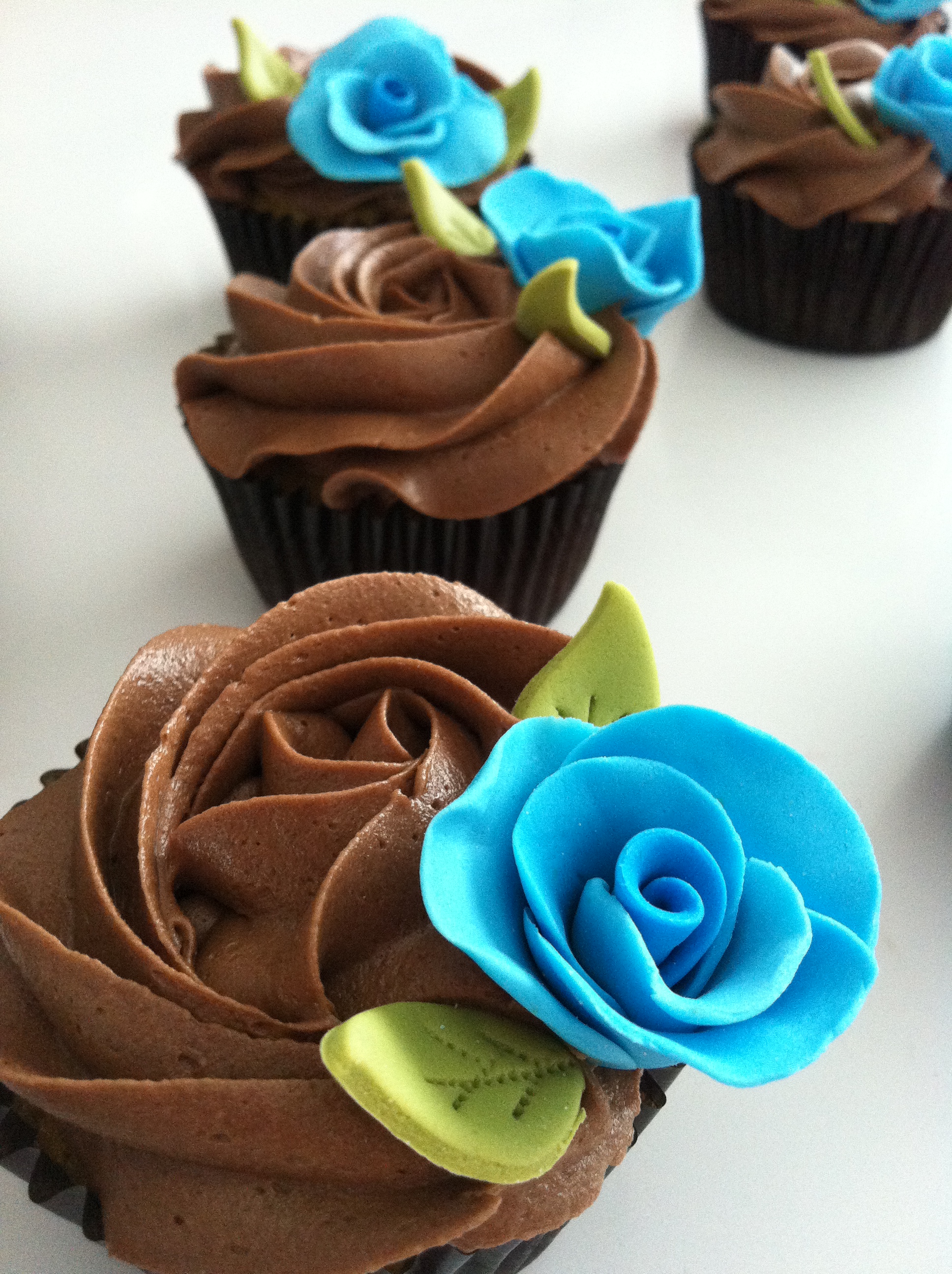 Llenamos la manga pastelera con la crema y ponemos una boquilla 1M de Wilton. La ponemos en posición vertical en el centro del cupcake, apretamos y cuando haya salido un pegote de crema empezamos a hacer movientos circulares de dentro hacia fuera hasta que lleguemos al borde del cupcake. Ya tendremos la rosa de nutella hecha.Ahora sólo nos queda adornar con las rosas de fondant y las hojas. Para hacer las rosas y las hojas en este tutorial.