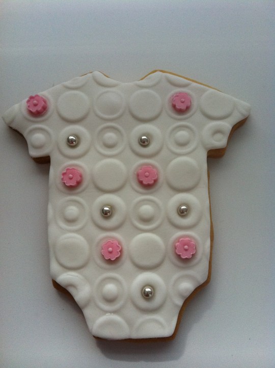 Los patitos amarillos son de mazapán y las margaritas de azúcar. Las florecitas pequeñas las hice con fondant con un microcortador, igual que el lazo que lo hice con un molde de silicona, que tengo con varios tamaños de lazo ,superútil y rentabilizado. Las bolitas plateadas que hacen de los cierres del body son de caramelo y las rayas plateadas y el baby están pintados con pintura líquida plateada comestible que se aplica con pincel. Los corazones blancos también son de azúcar.