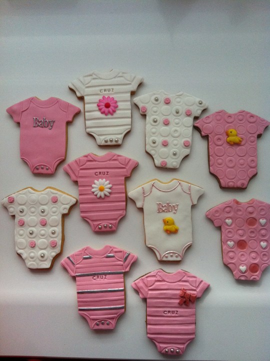 Junto a las bodys iban unos biberones decorados con glasa y unos patucos blancos con lunares rosas. Como sigo recapitulando cosas a lo mejor algún día aparecen por aquí.