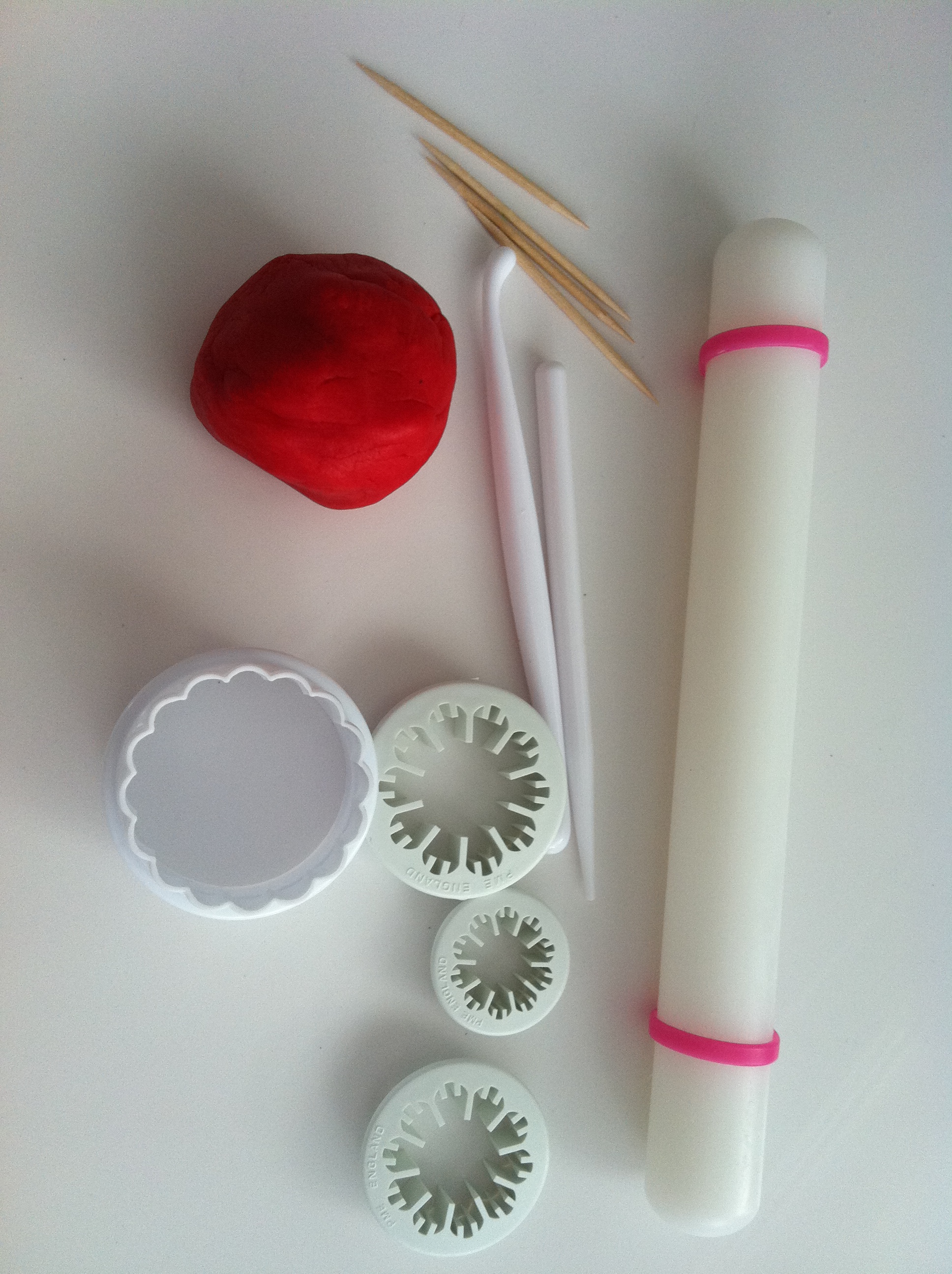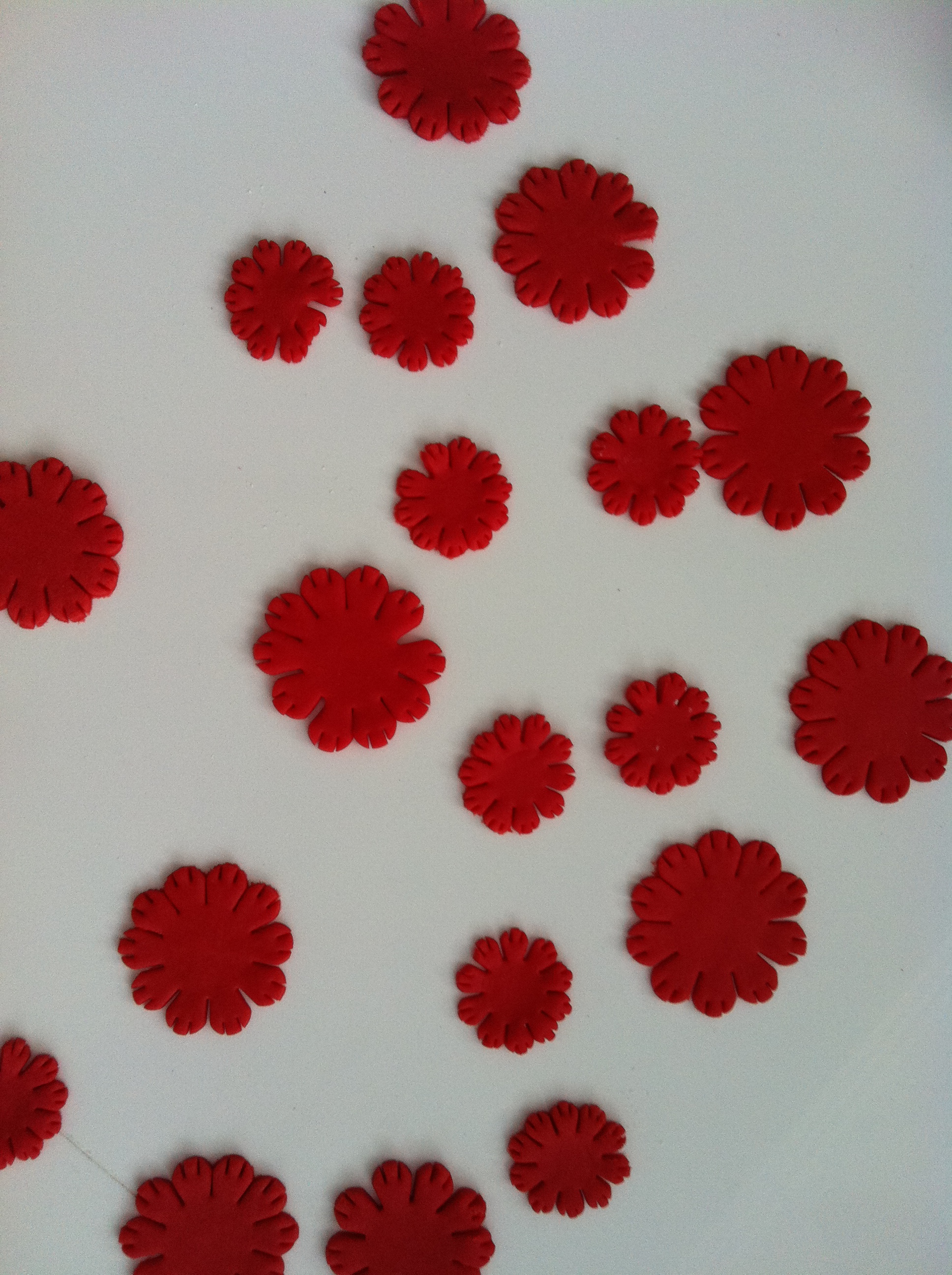 Yo elegí fondant rojo. Primero tenemos que amasarlo bien y pasarle el rodillo para dejarlo finito, sin olvidarnos de poner maicena o azúcar glass sobre la superficie para que no se pegue. Vamos a empezar con los claveles que hice más pequeños, para los que utilicé tres cortadores específicos para clavel (que son los dos que tiene forma de flor). Una vez estirado el fondant procedemos a cortar los pétalos.