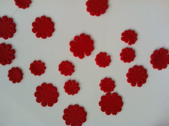 Para cada flor necesitaremos tres flores en tres tamaños diferentes. En esta foto véis cómo quedarían ya cortados.