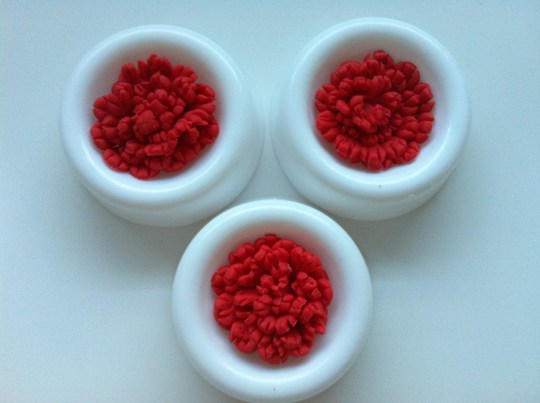 Una vez que tenemos la flor con la forma deseada que hemos conseguiso abriendo los pétalos, pellizcándolos con los dedos e incluso cortandolos más con unas tijeras un poco por la parte superior, los dejamos a secar sobre un trozo de papel vegetal en algún cuenquito redondo para que guarden esa forma. Yo los puse sobre unos secadores que tengo de flores de plástico, como véis.