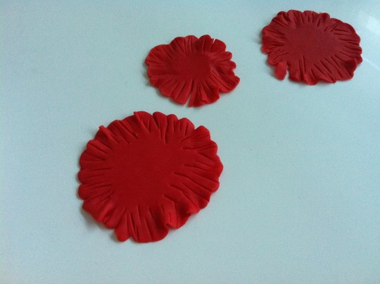 Estiramos el fondant con el rodillo y cortamos con el cortador las tres flores.Esta vez tenemos que afinar los bordes pasando una esteca redondeada como en forma de gota la tenéis en la foto). Lo haremos sobre una superficie blandita , como una esponja, aunque yo lo hago siempre sobre la palma de la mano. De esta manera quedan los bordes ondulados.