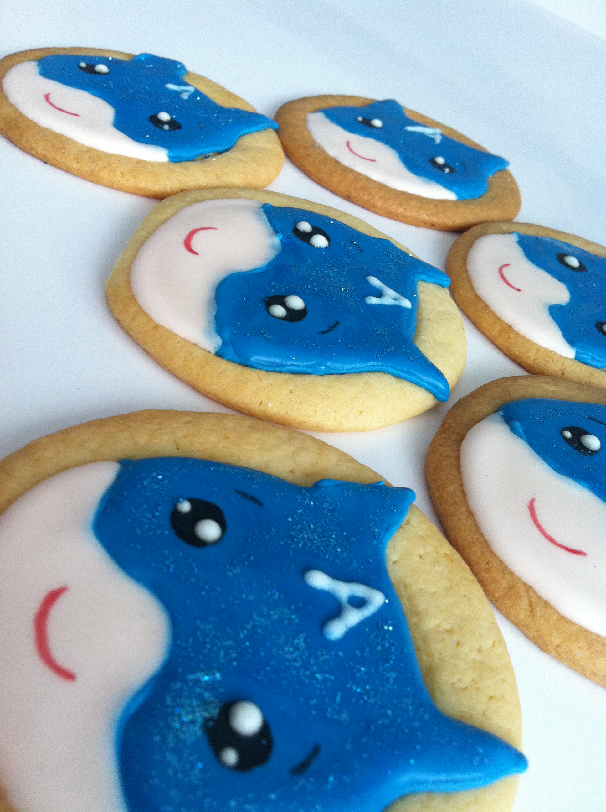 Nuestro Capitán américa lleva el color azul real de Wilton, color carne para la cara y blanco. La letra la hice con una boquilla del uno y le puse purpurina azul sobre la máscara. Sólo hace falta mojar muy levemente el pincel en agua, pasarlo por la purpurina y ya podemos pintar sobre la galleta. La boca está dibujada con rotulador de tinta comestible rojo.