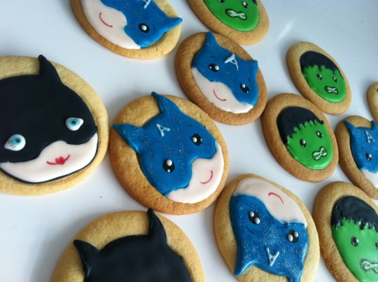 La cat woman fue la más complicada, sobre todo por los ojos almendrados, que hice con una boquilla del dos en posición vertical y con un palillo estirando los ojos hacia fuera para «achinárselos» tipo «gatuno». Luego los pinté con rotulador de tinta comestible azul y negro. La boca también está hecha con rotulador de tinta comestible roja.