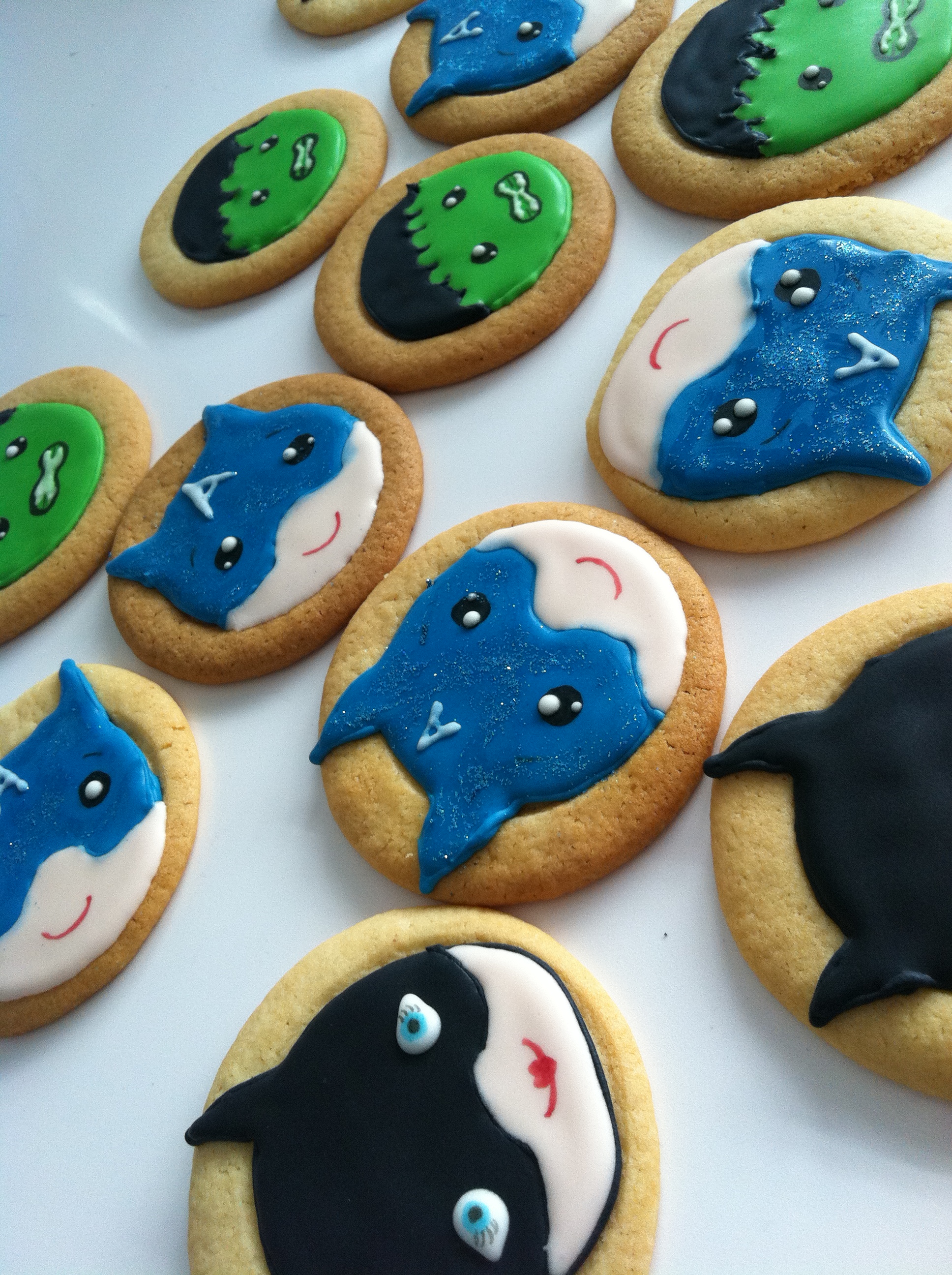 Para hacer las caras es mejor ayudarse con un cortador redondo (del tamaño de la cara que queramos hacer), que pondremos sobre la galleta. Con un rotulador comestible marcamos el círculo. Luego seguiremos como patrón esa línea para delimitar la cara con glasa de delineado (la más espesa) y una vez seco lo inundaremos con glasa más fluida del mismo color.