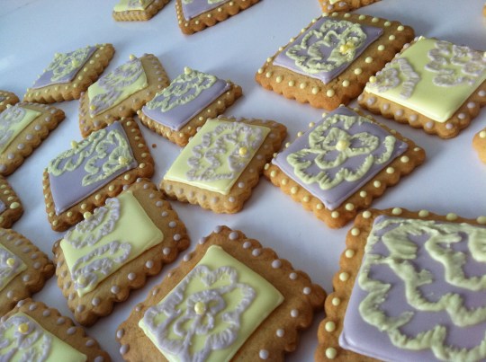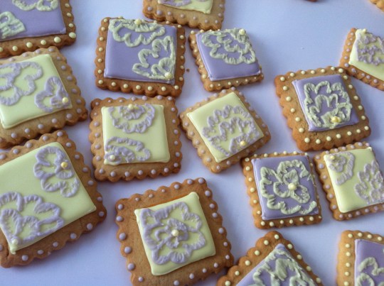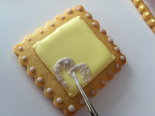 Para que los cuadrados nos queden lo más simétricos posible es mejor marcarlos con rotulador comestible y con un cortador sobre nuestra galleta. Luego sólo tendremos que seguir la línea ya dibujada con nuestra manga, la boquilla del 2 puesta y la glasa de delineado, que es más espesa que la de relleno. Inundamos nuestro cuadrado bien con la glasa fluida del mismo color y dejamos secar completamente (unas 3 o 4 horas mínimo).