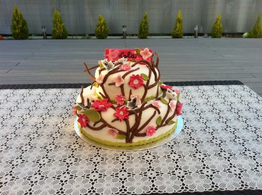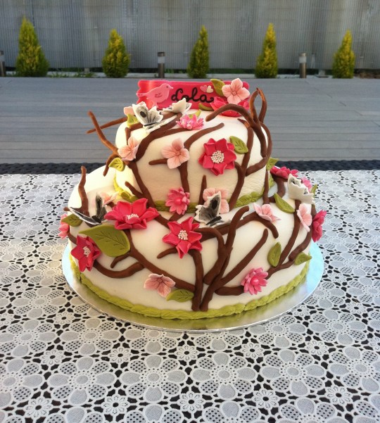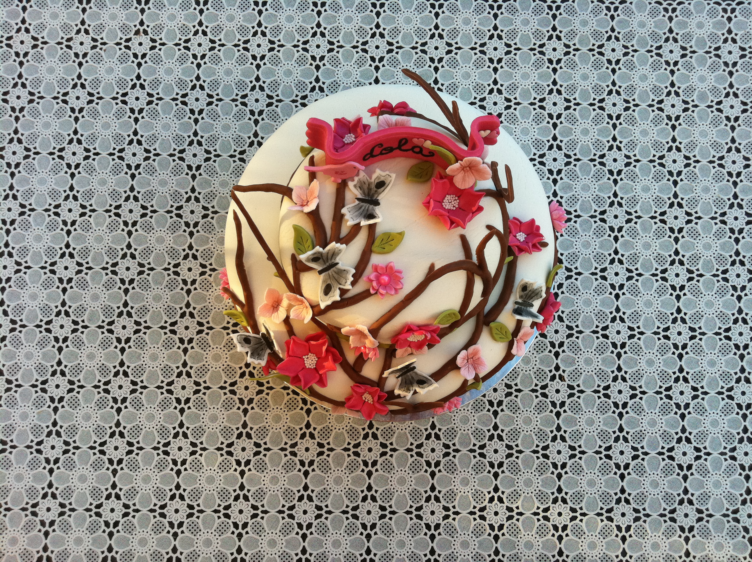 Todas las flores, mariposas y la banda con el nombre hay que hacerlas un día antes , para que dé tiempo a que se sequen y tomen la forma que buscamos. También dejé hechas algunas ramas, ya que quería que quedarán rígidas y sobresalieran por los laterales de la tarta. El resto de las ramas las hice en el momento para que se adaptaran a la forma del bizcocho.