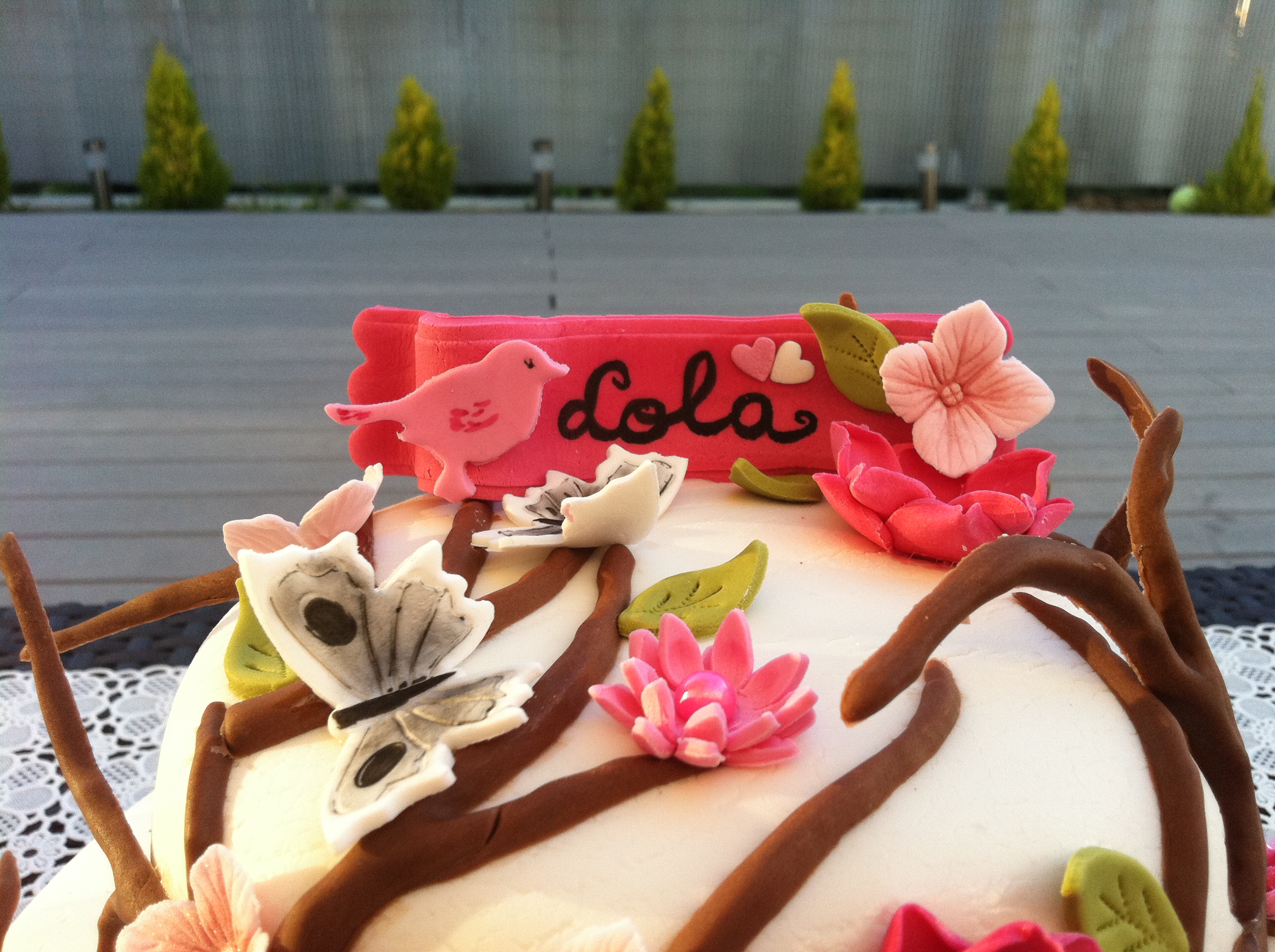 Toda la decoración este hecho con fondant y bolitas de caramelo. Las mariposas está pintadas con pintura polvo negra comestible y el nombre con rotulador negro también de tinta comestible.