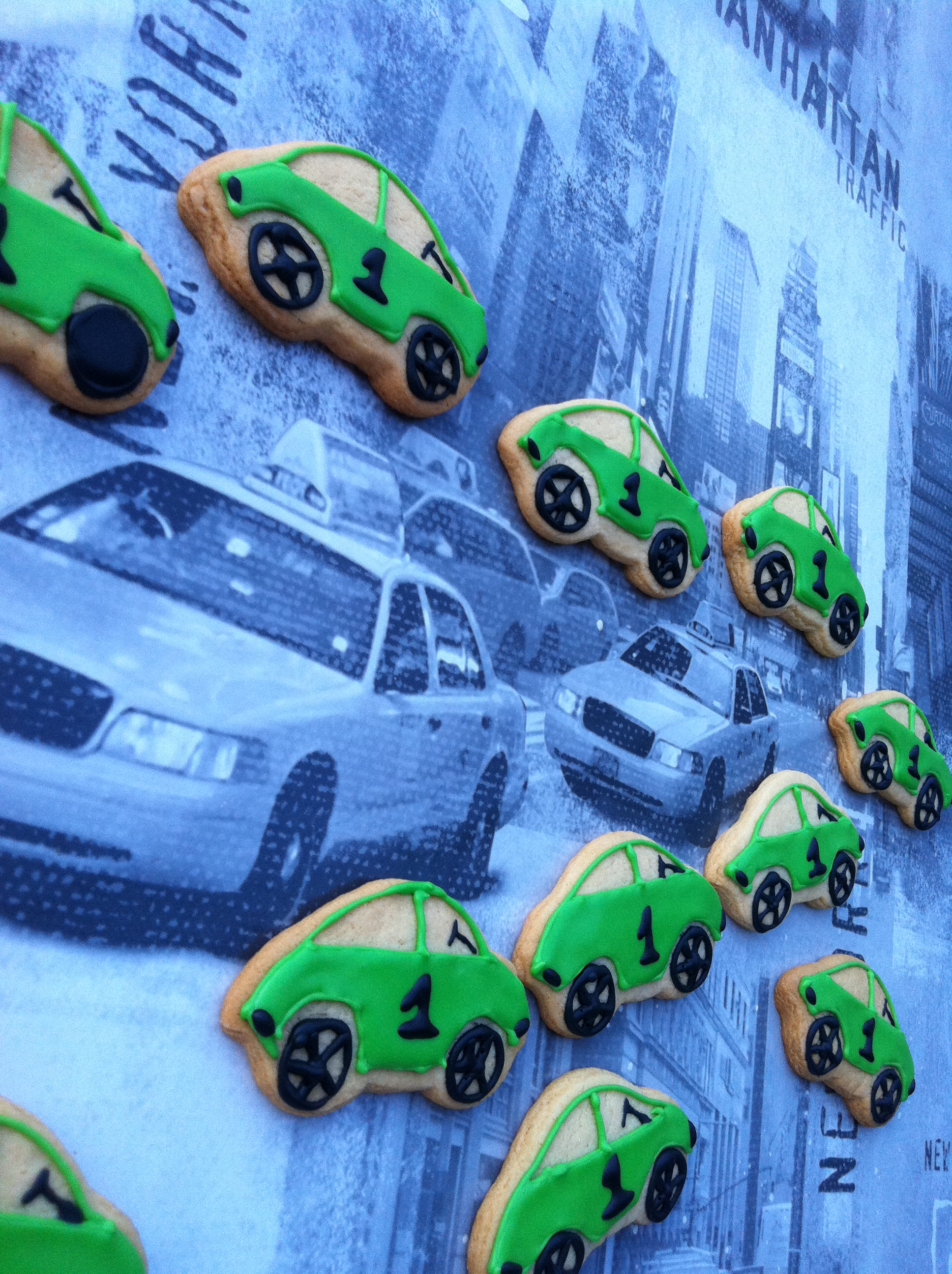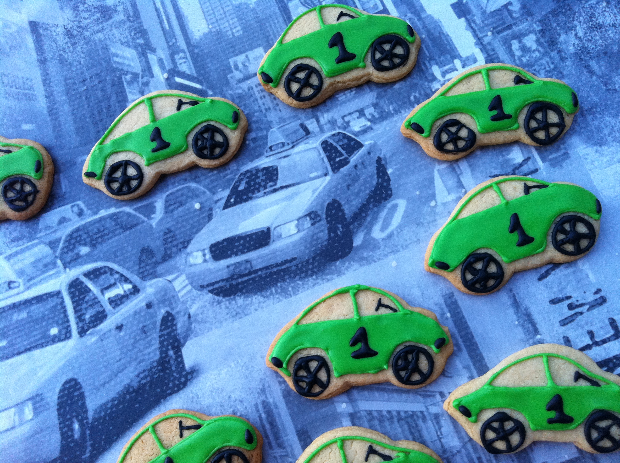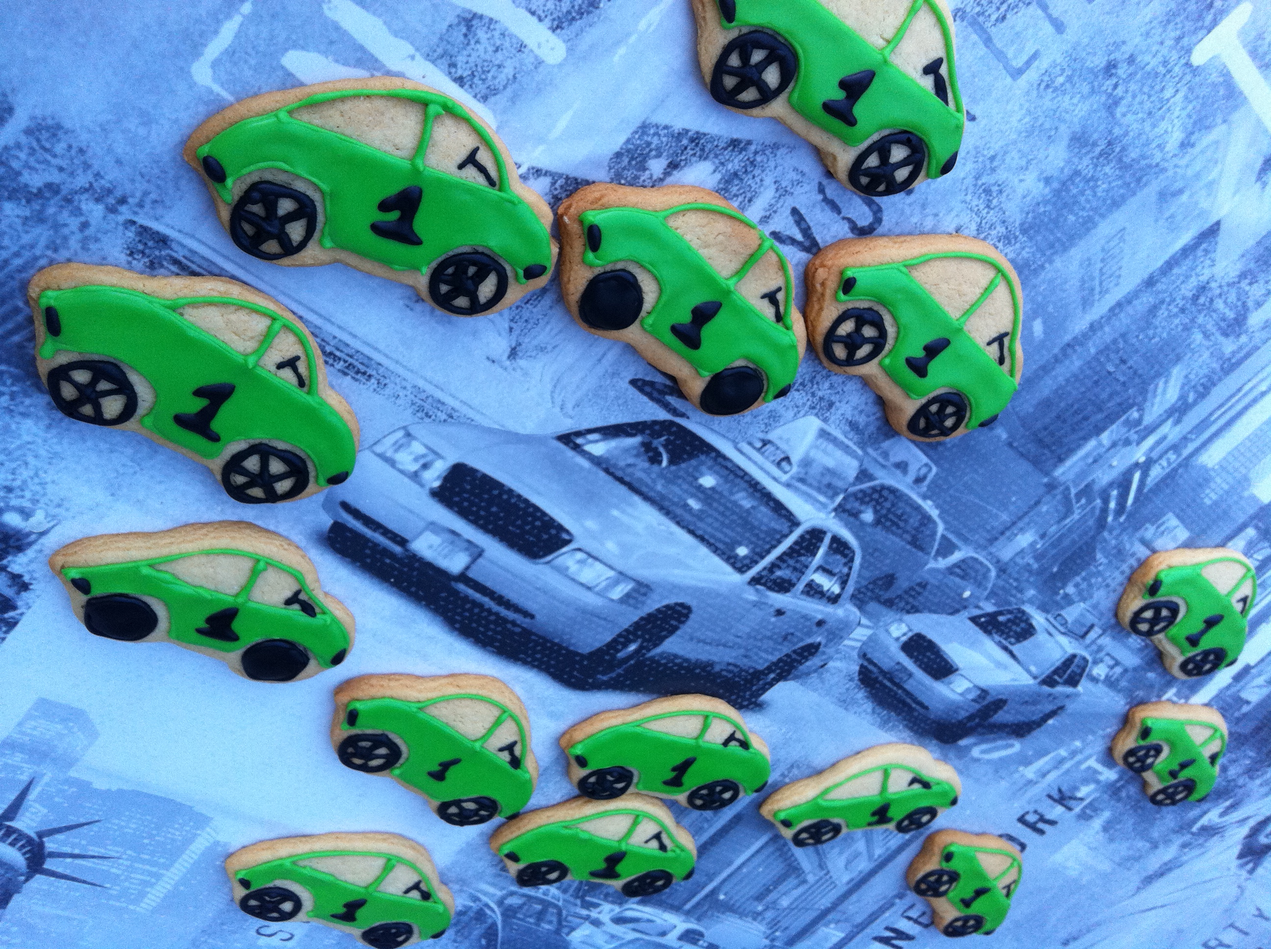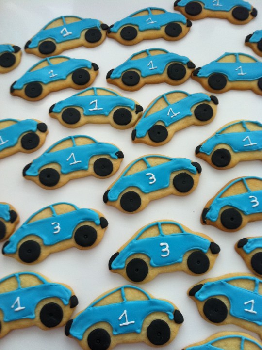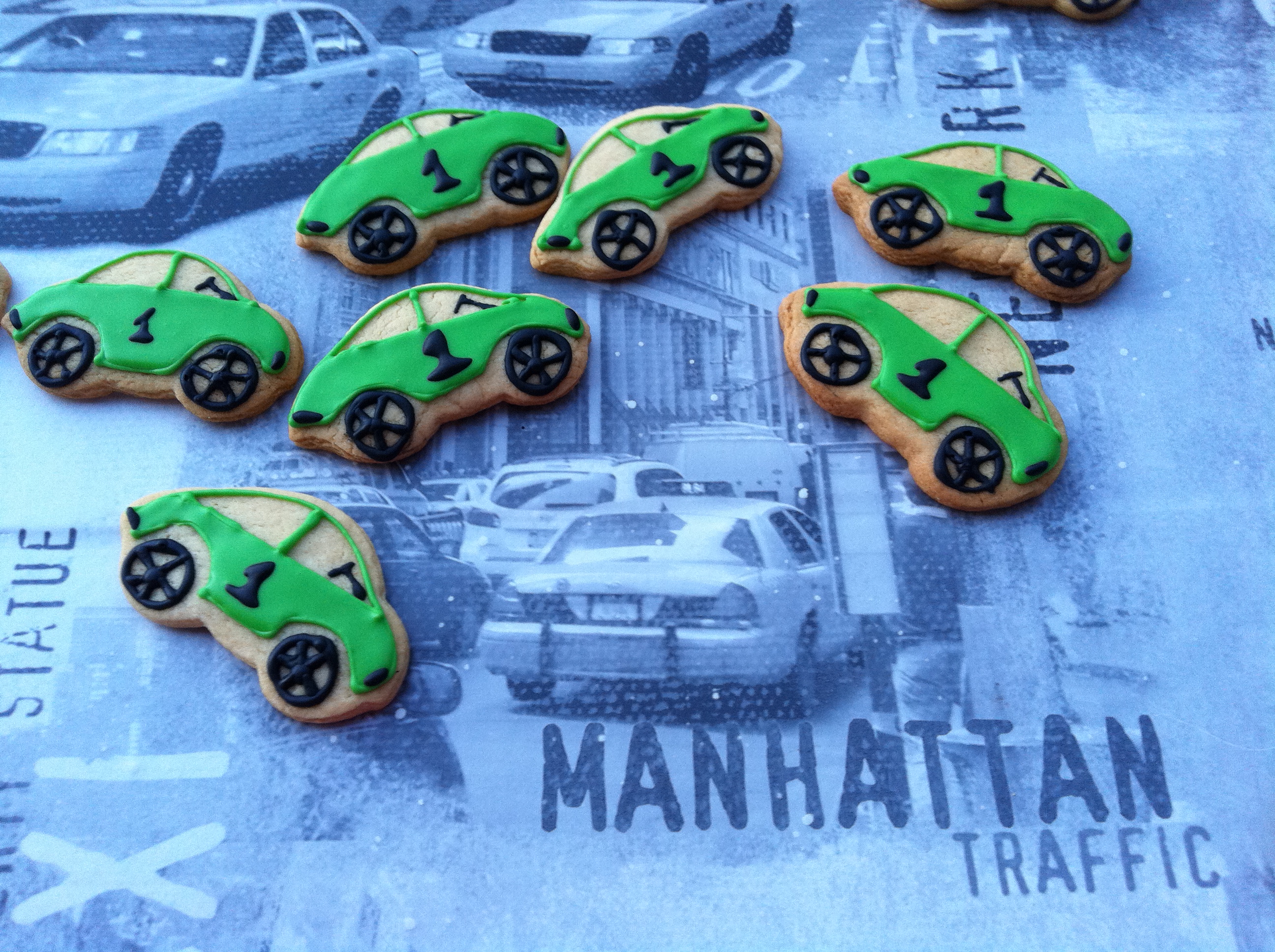 La receta de la glasa os la dejo también con este enlace. La de los coches azules la teñí con color azul de Wilton y la verde con el color verde de Wilton.