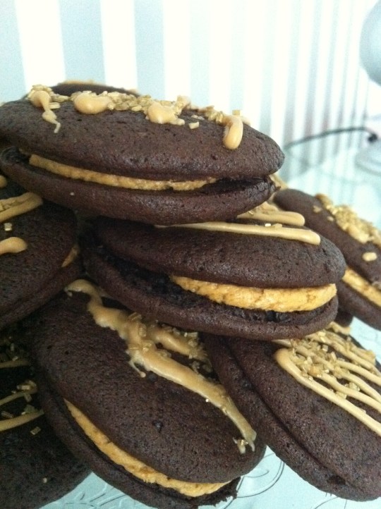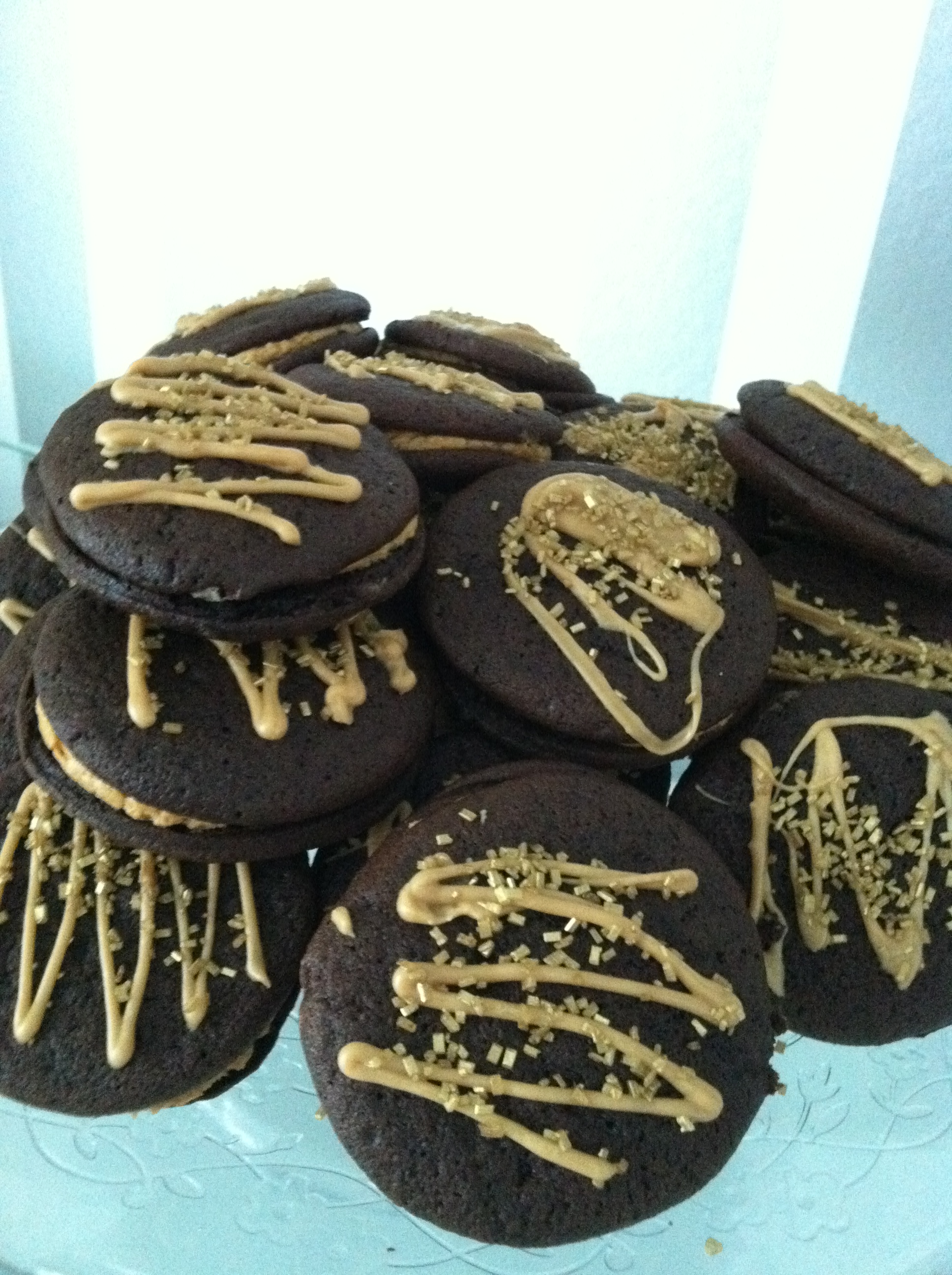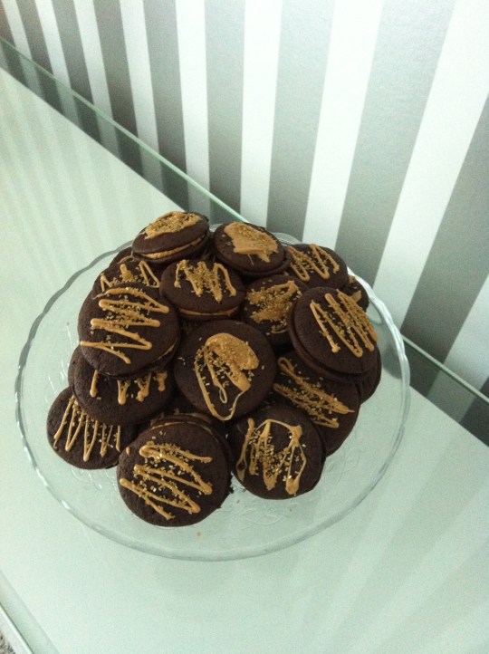 Para terminar fundí chocolate con sabor a toffee de la marca Renshaw. Vienen en bolsitas de 200 grms y sólo hay que fundirlos en el micro siguiendo las instrucciones. Una vez fundido lo echamos sobre el whoopie (yo lo hice con un biberón) y encima eché azúcar color dorado.
