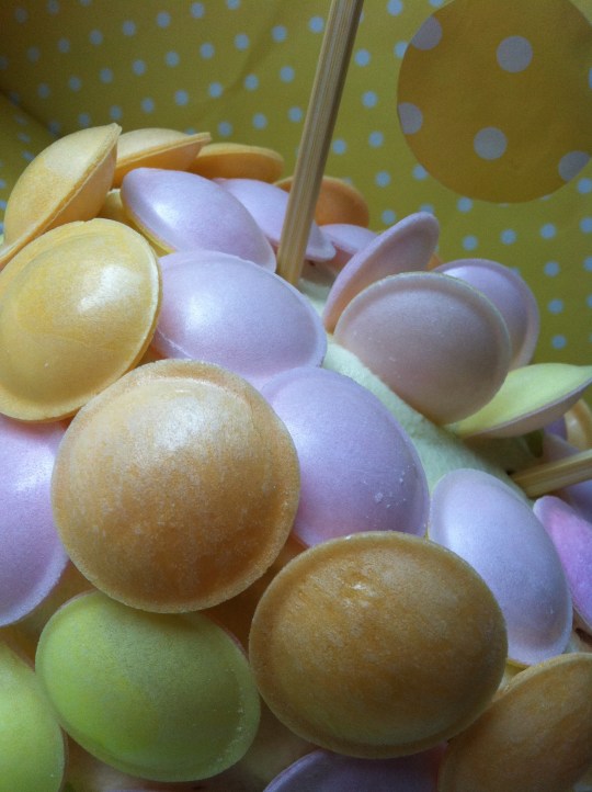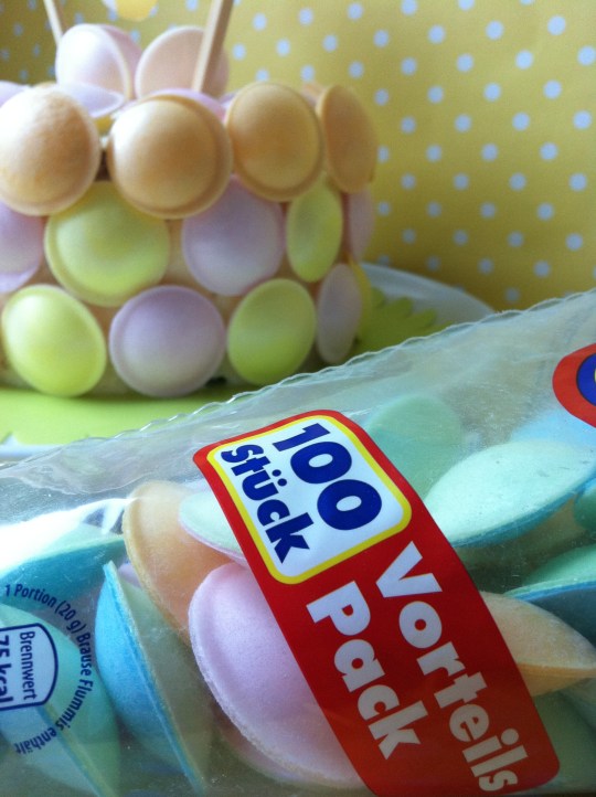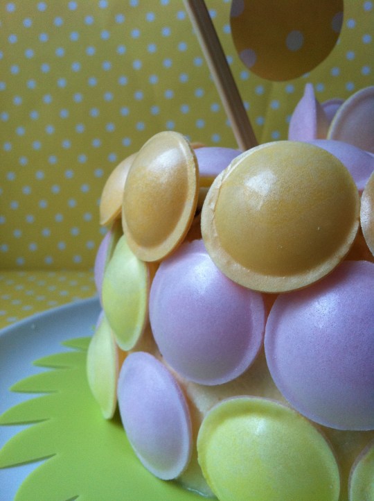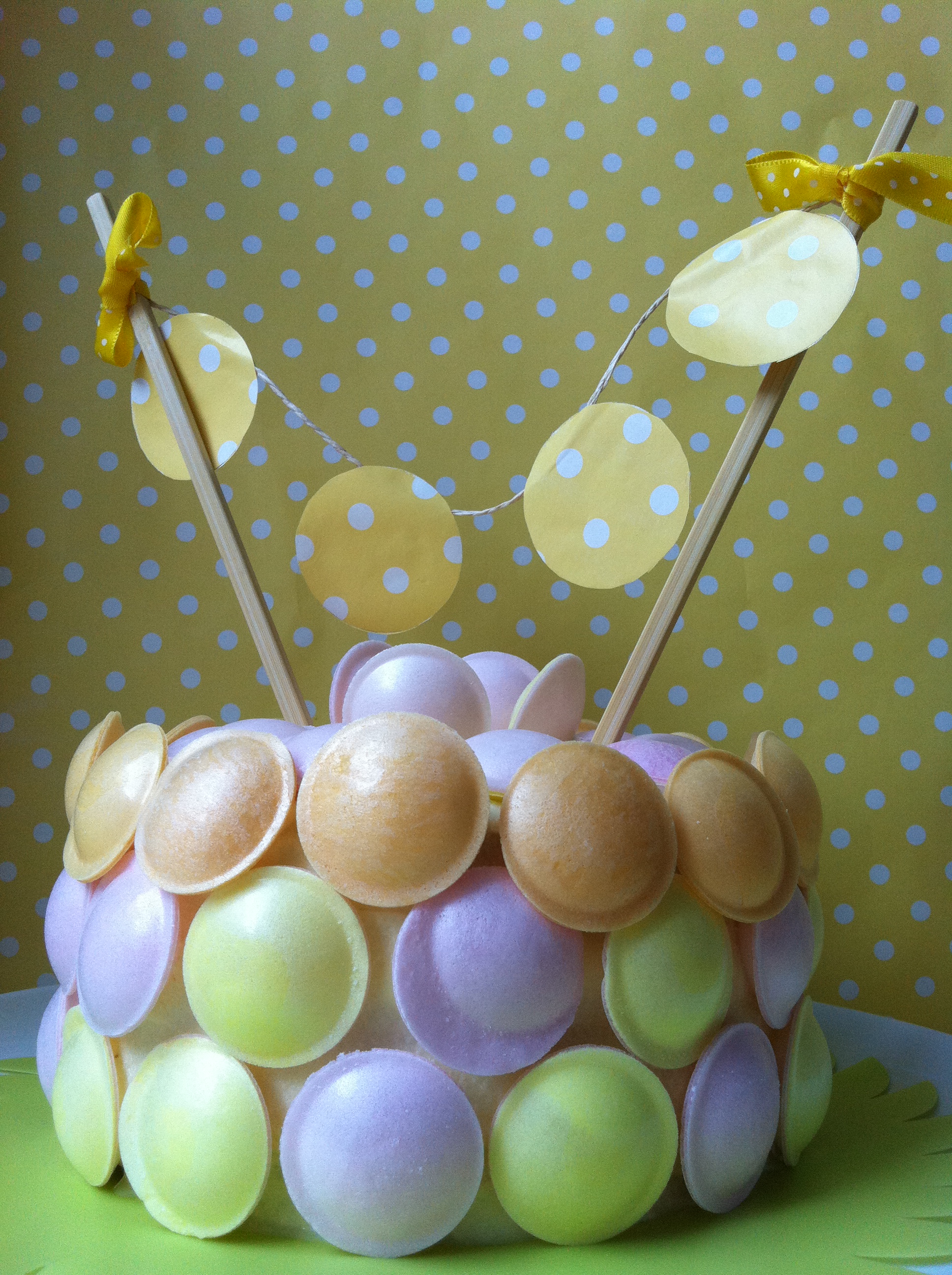 Para la decoración nada más pegué sobre la crema de queso los discos de colores y le hice una guirnalda con papel de regalo cortado en círculos, un cordón de cáñamo y dos palillos de madera chinos rematados con dos lazos de lunares amarillos. Una vez pegados los círculos al cordón lo atamos en la parte superior de los palillos chinos y le hacemos los dos lazos para terminar.