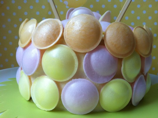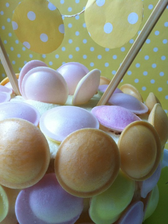 Entre bizcocho y bizcocho la rellené con swiss meringue de queso, con el que también la cubrí, y que sirvió de «pegamento» a los discos de colores que la decoran. Necesitaremos: