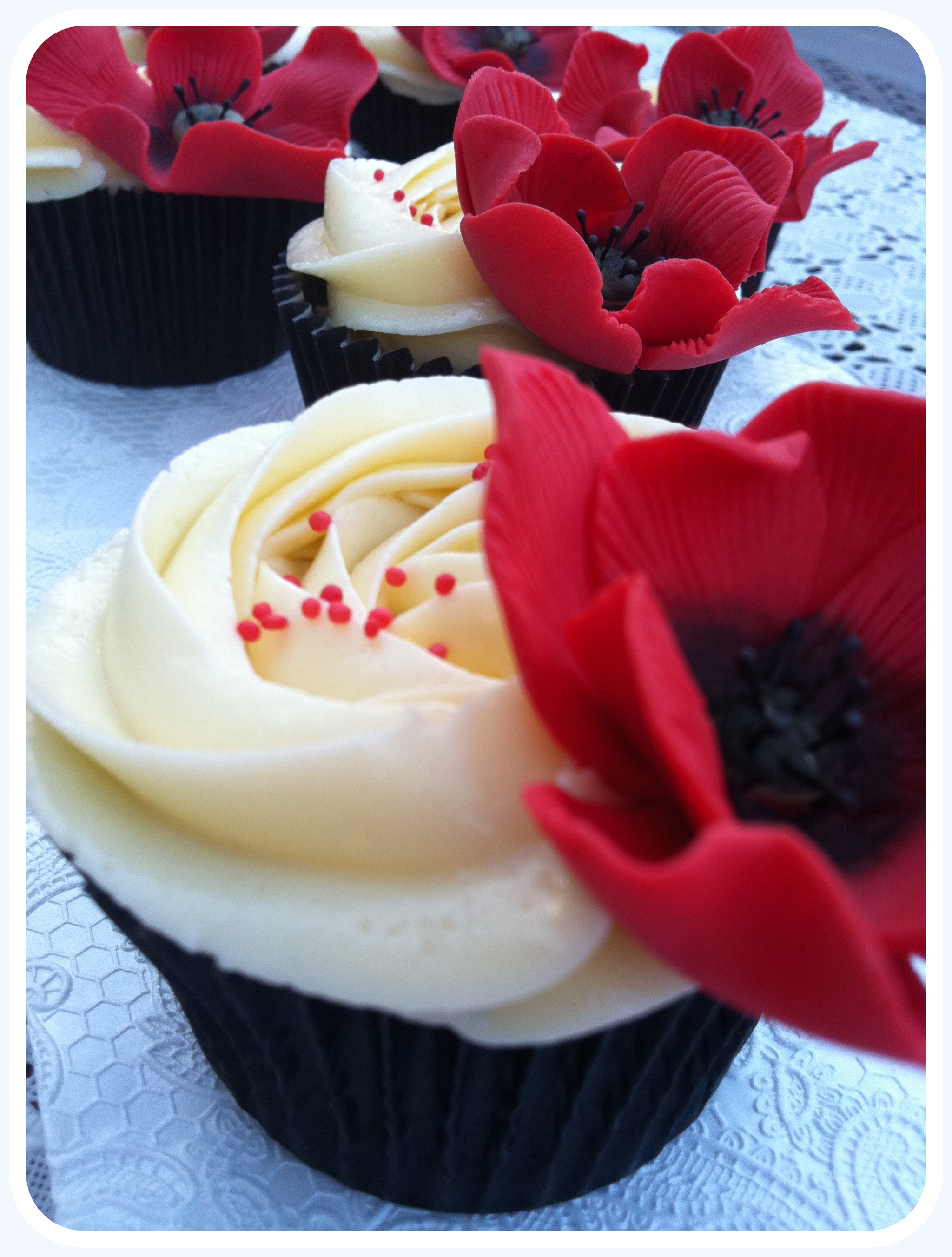 Su primer cometido era que no acabaran los susodichos tarritos en el fondo de la basura…. y…. su segundo cometido era utilizar como decoración las amapolas que había hecho para el tutorial , del que ya tenéis la entrada en el blog. De esta manera maté dos pájaros de un tiro y …¡¡Cometidos cumplidos y cupcakes engullidos!