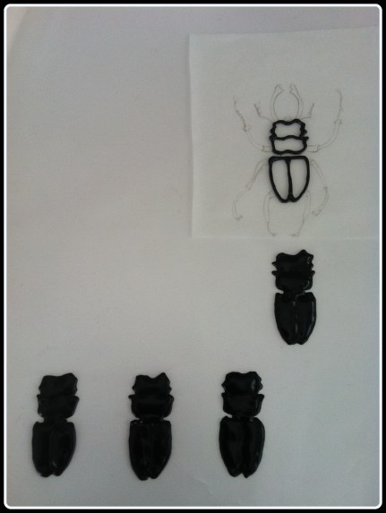 Por otro lado habremos hecho ya los cuerpos de nuestro escarabajos con la técnica transfer, que consiste en dibujar con glasa, manga pastelera en mano, sobre una lámina de acetato transparente o similar la figura que hayamos elegido.