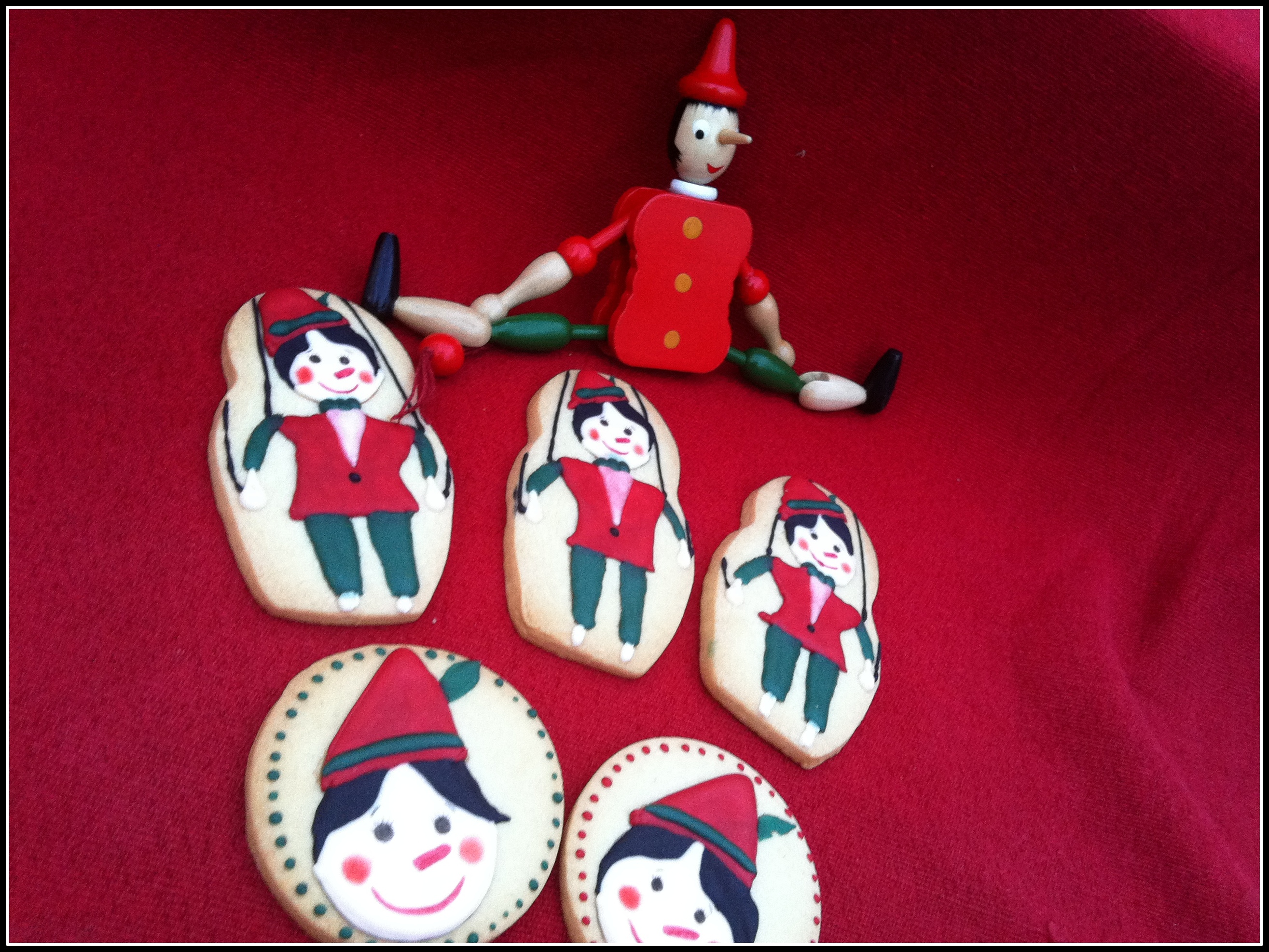 Teñí la glasa (os dejo enlazada la receta) de: color carne para la cara, manos y piernas , negro para el pelo, el botón y los hilos de la marioneta , rojo para la chaqueta y el gorro, el verde para los pantalones y los detalles del gorro y el blanco para la camisa. Total que al final te juntas con 5 mangas con diferentes colores, coge, deja, coge , deja……..