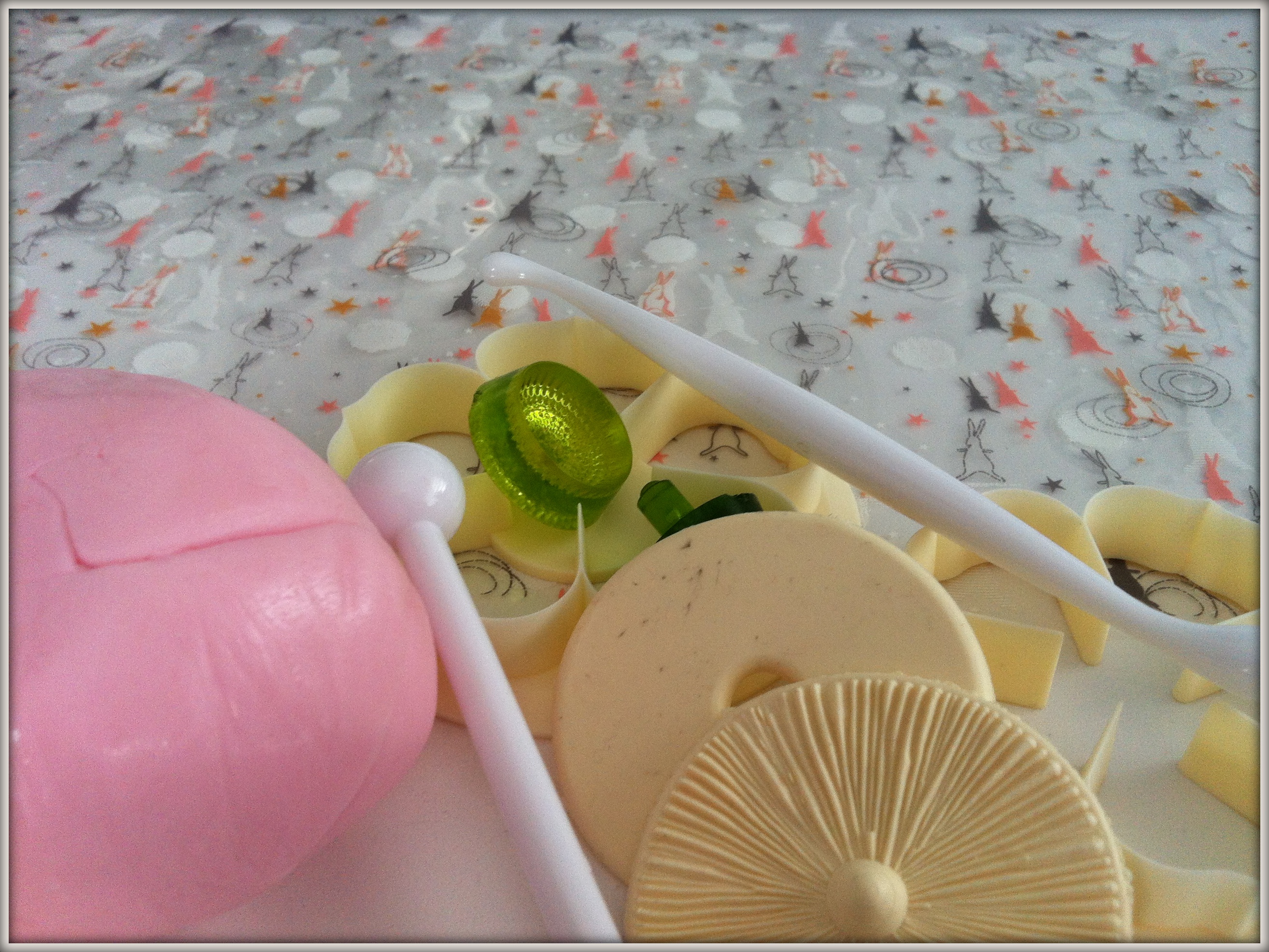 Esta vez me ha sobrado el formador de centro de flores verde, que al final no utilicé. No he puesto tampoco el rodillo para extender el fondat, ni las bolitas ni el azúcar negro que utilicé para el centro, ni el colorante en polvo negro (aunque este si aparece en otra foto)…. Perdón…