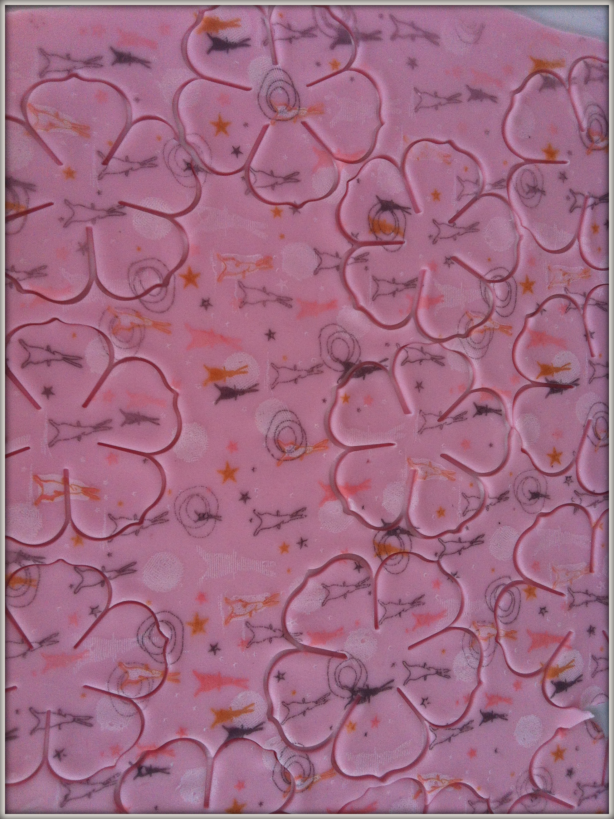 Como véis el fondant tiene unos dibujitos impresos. Lo ideal es que el dibujo sea cuanto más pequeño mejor si lo vais a utilizar para flores o cualquier forma pequeña.Mis conejitos estaban demasiado dispersos y por esos no se aprecian demasiado.