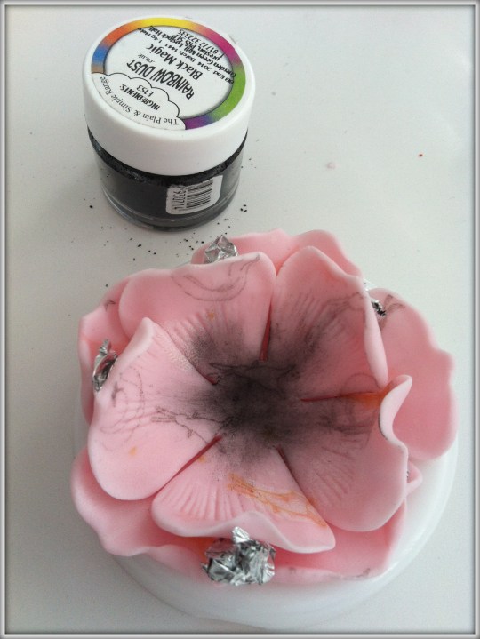 Ahora tenemos que hacer el centro de la flor. Apliqué un poco de CMC diluido en agua con un pincel en el centro y le coloqué la bolita de caramelo.Encima eché el azucar negro, que quedará pegado en toda la zona en la que hayáis aplicado el CMC.