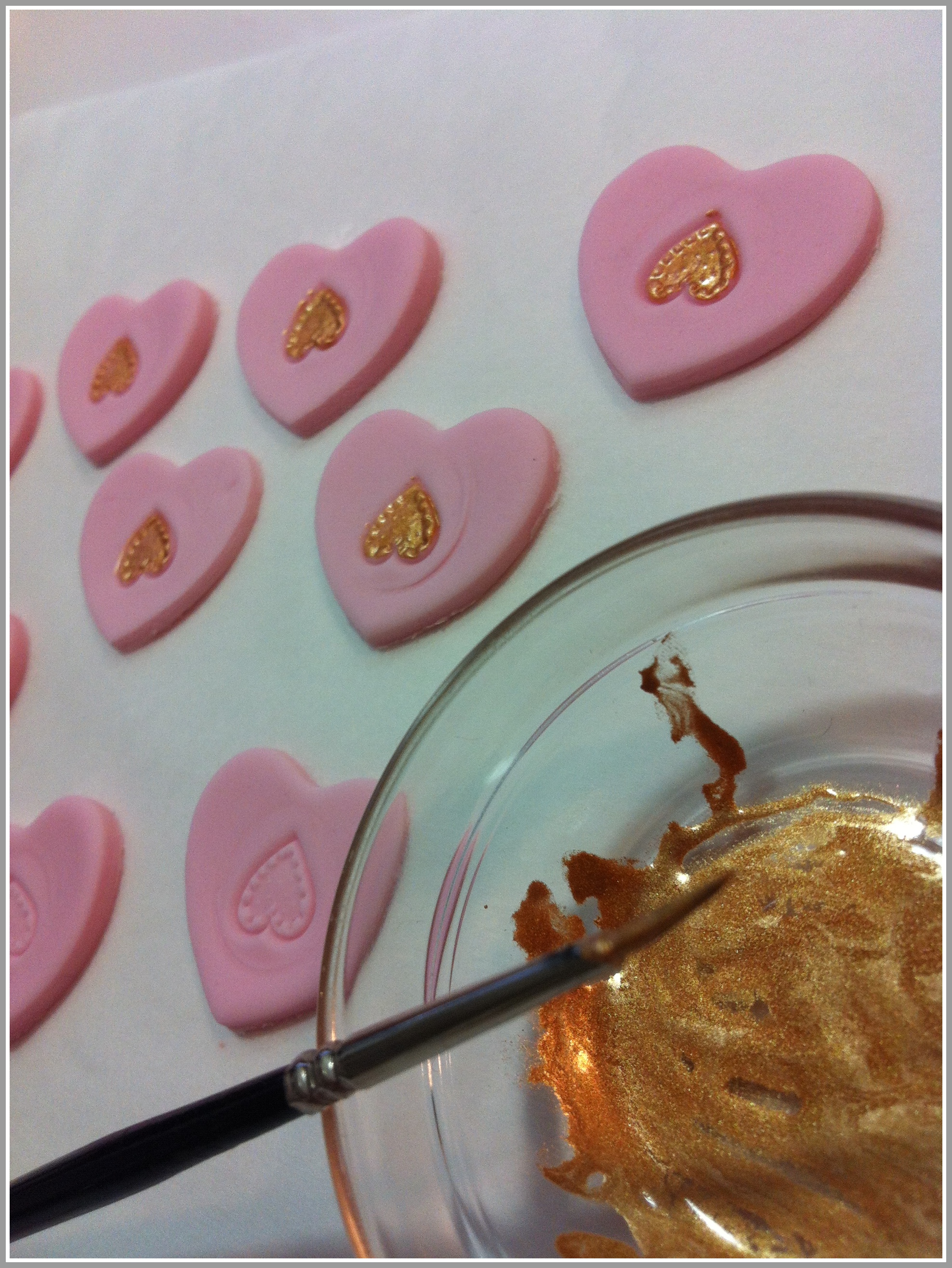 Diluimos colorante en polvo dorado (el mío es de Squires Kitchen) en unas gotitas de vodka y con un pincel del nº0 pintamos el interior de los corazones.
