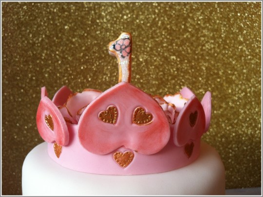 En la primera visual al reciente libro de Patricia Arribálzaga De Cakes Haute Couture , ya le eché yo el ojo a una coronita que estaba decorando un apetecible cupcake de banana con dulce de leche. En mi mente se quedó y utilicé la idea como topper para la tarta de Candela que cumplía un añito.