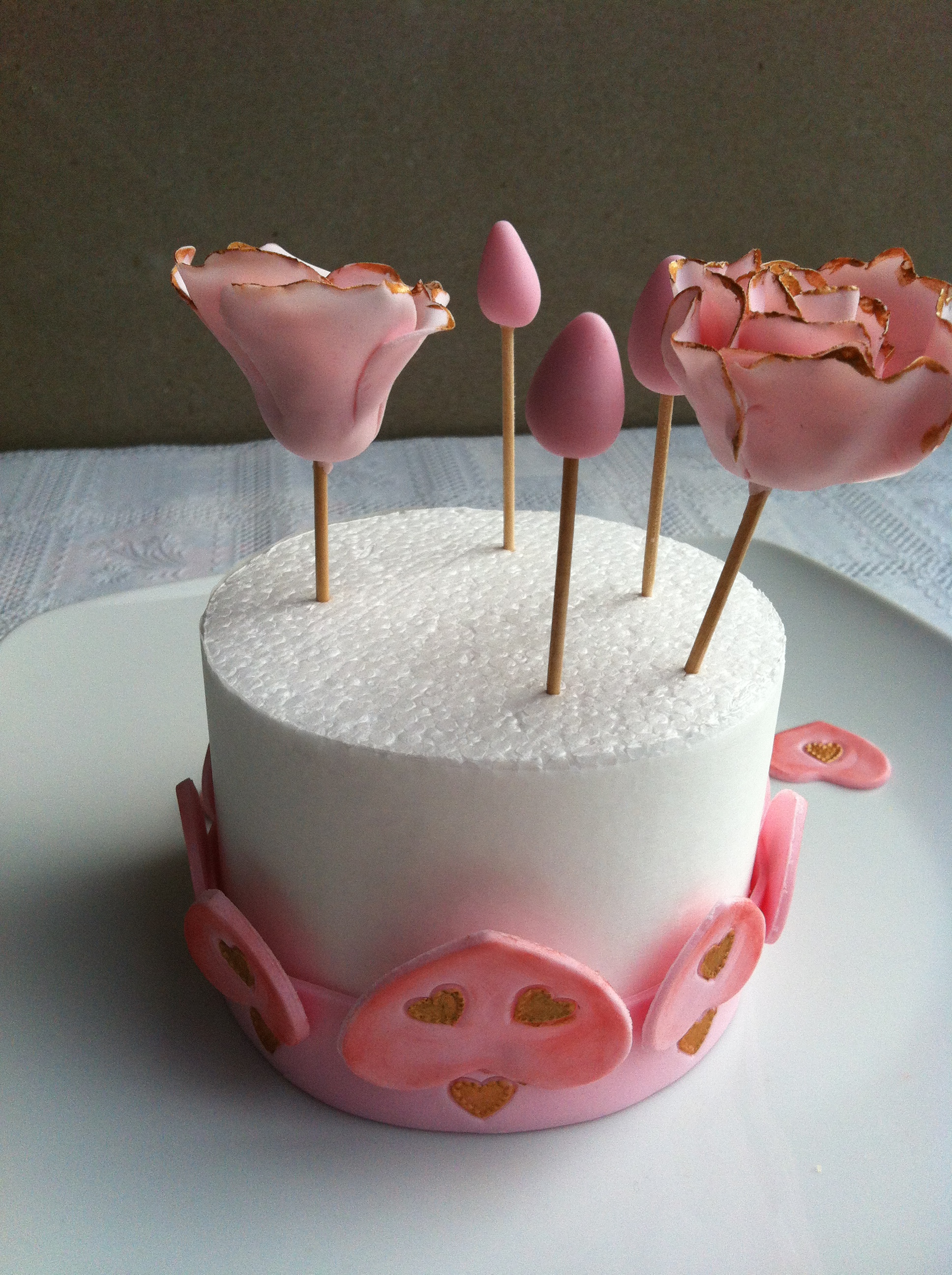 Cortamos una tira de fondant rosa suficientemente ancha para que nos quepan los corazones colocados de la manera que veis en la foto.