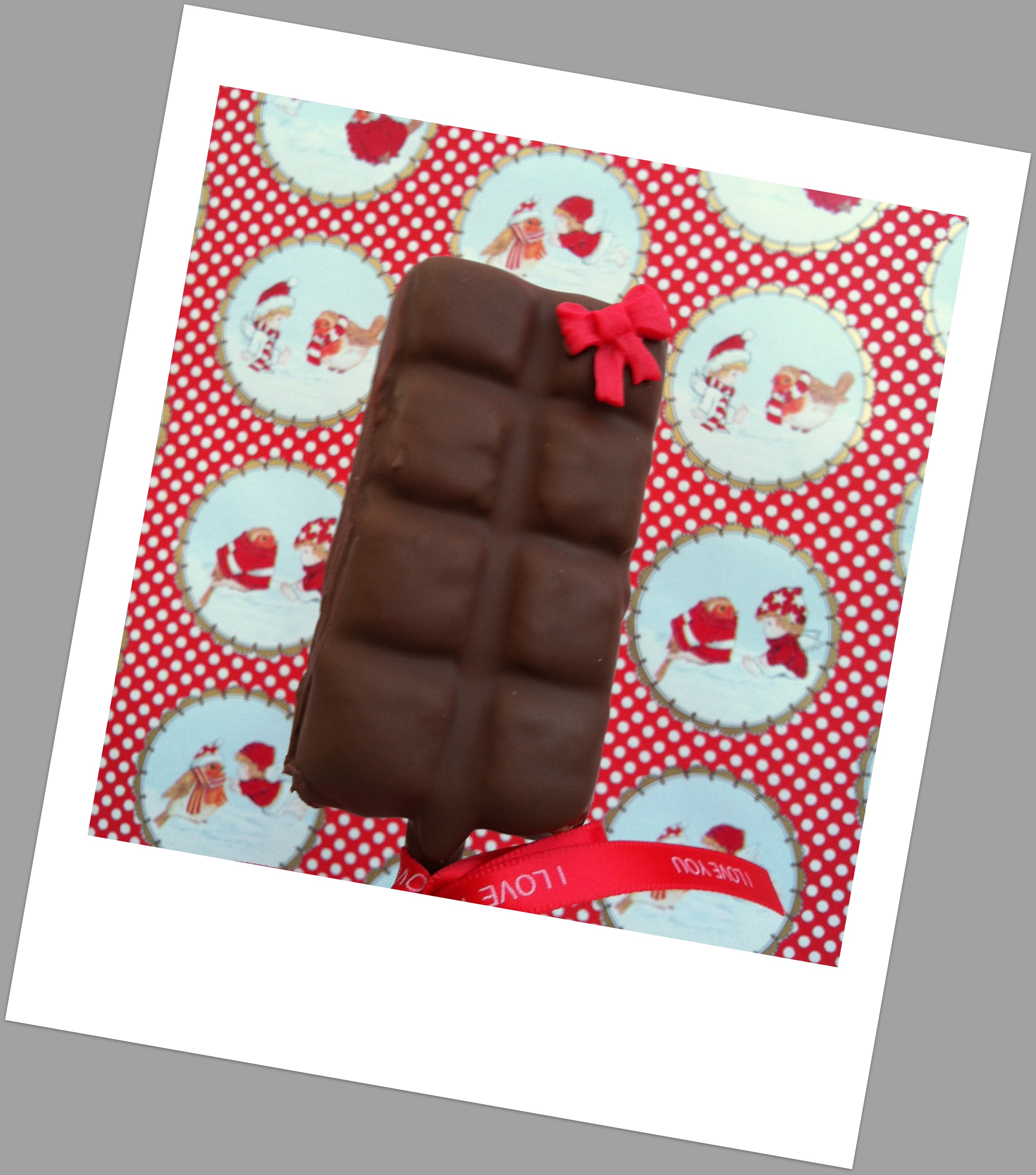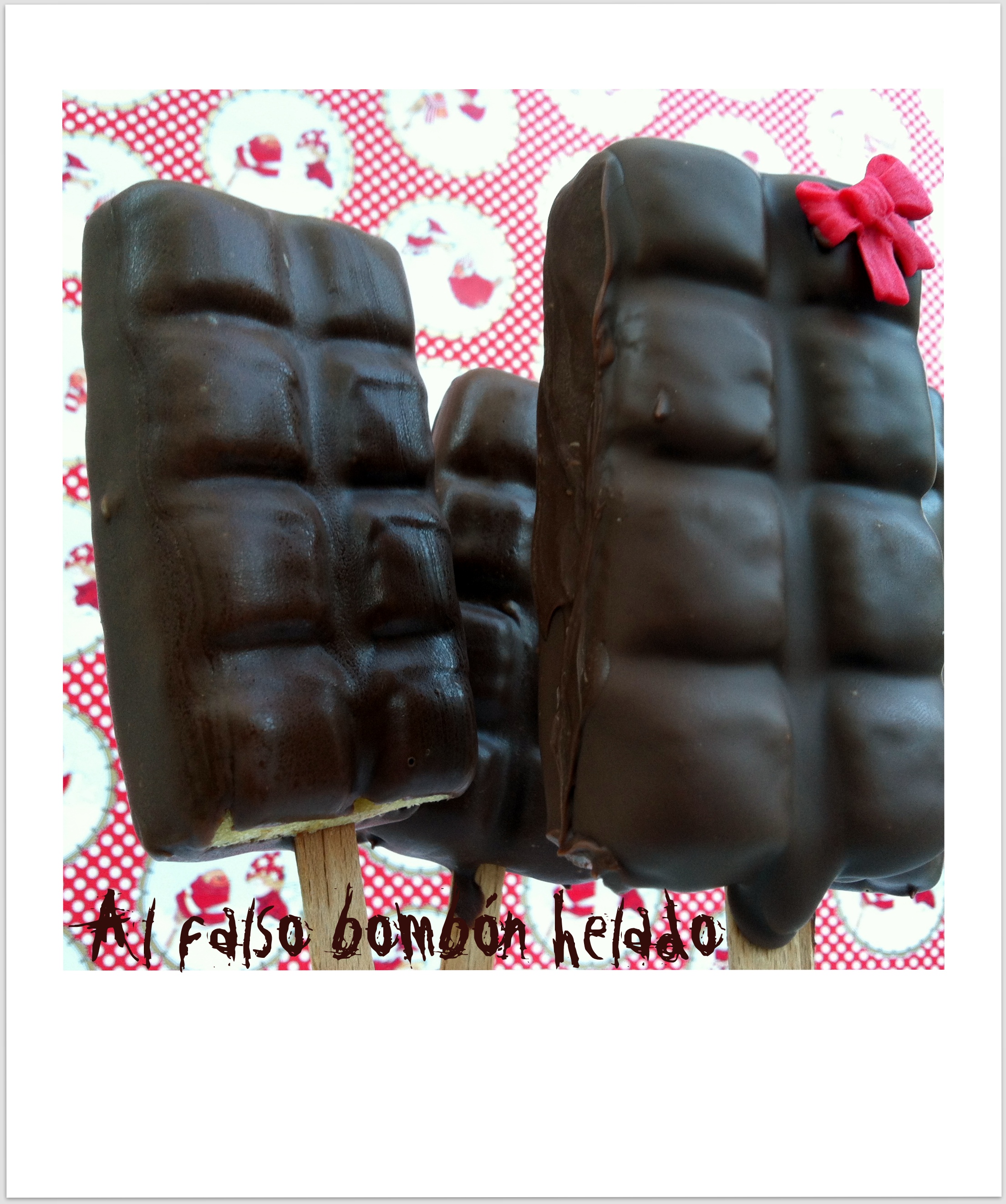 Derretimos el chocolate en una vaso ancho largo, donde nos quepa el helado de pie. Una vez derretido metemos sin miedo el helado. No se desprende porque después del horneado está bien pegadito. Lo sacamos y dejamos escurrir bien el chocolate (siempre de lado y dándole vueltas) hasta que no gotee. Lo pinchamos en un trozo de porespán o similar hasta que se solidifique del todo y , ¡listo!.