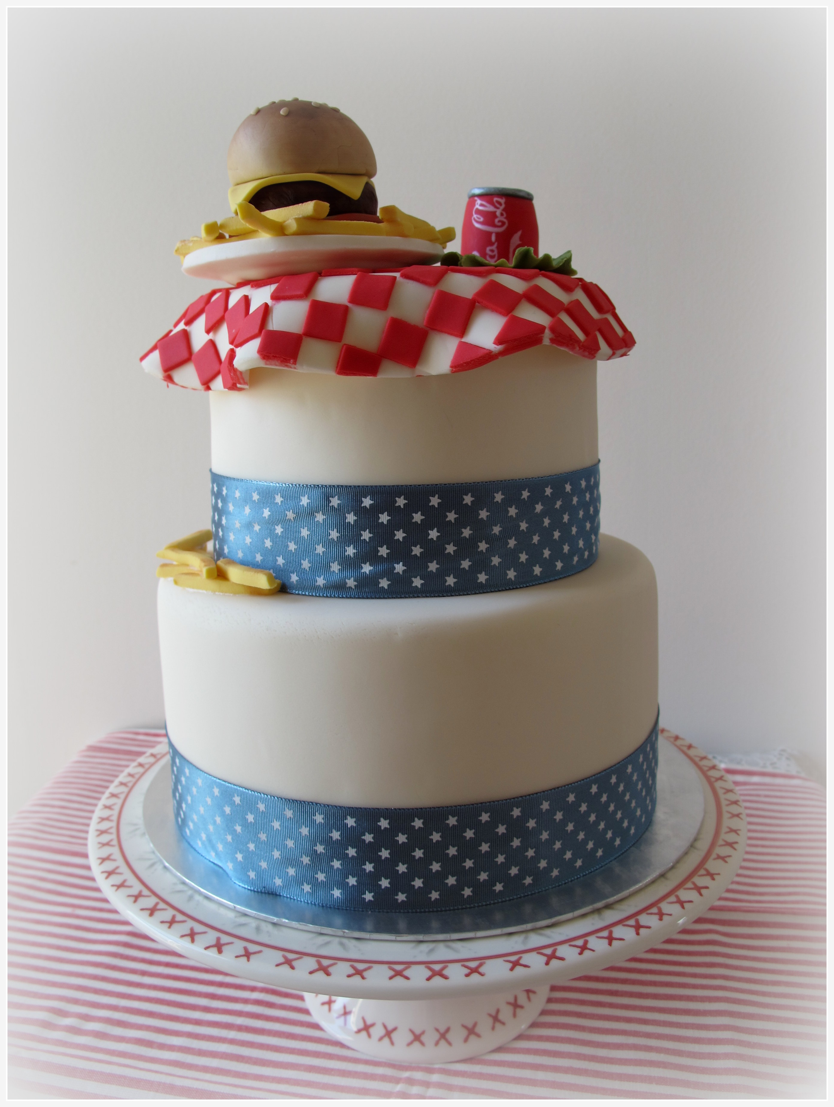 Pasamos a la segunda tarta, esta vez con hamburguesa americana, patatas fritas y Coca Cola.