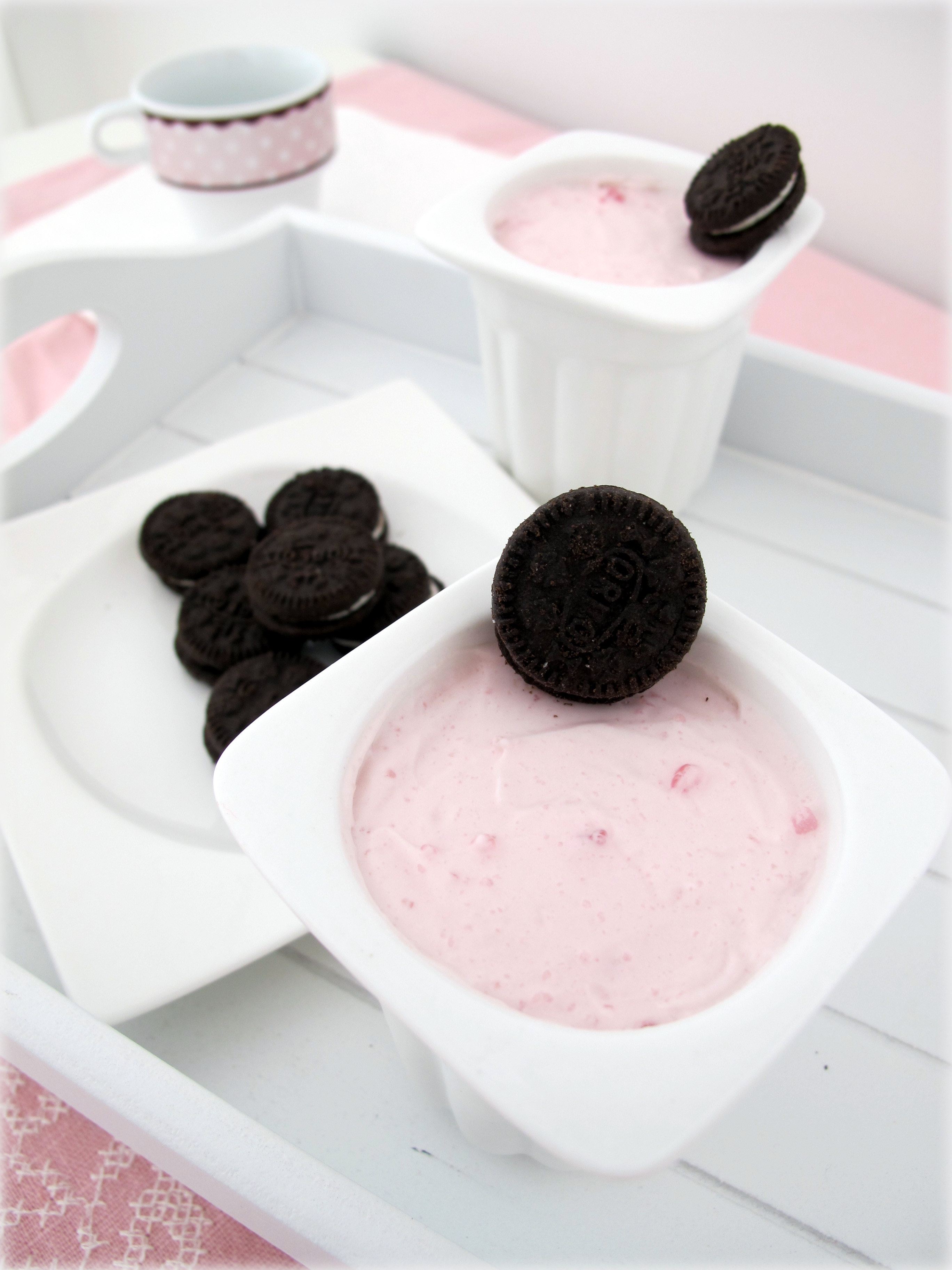 Esta es la primera receta que he probado. En el libro la receta es de fresa y yo la he hecho de frambuesa. Además he añadido una base de galleta oreo en cada vasito.