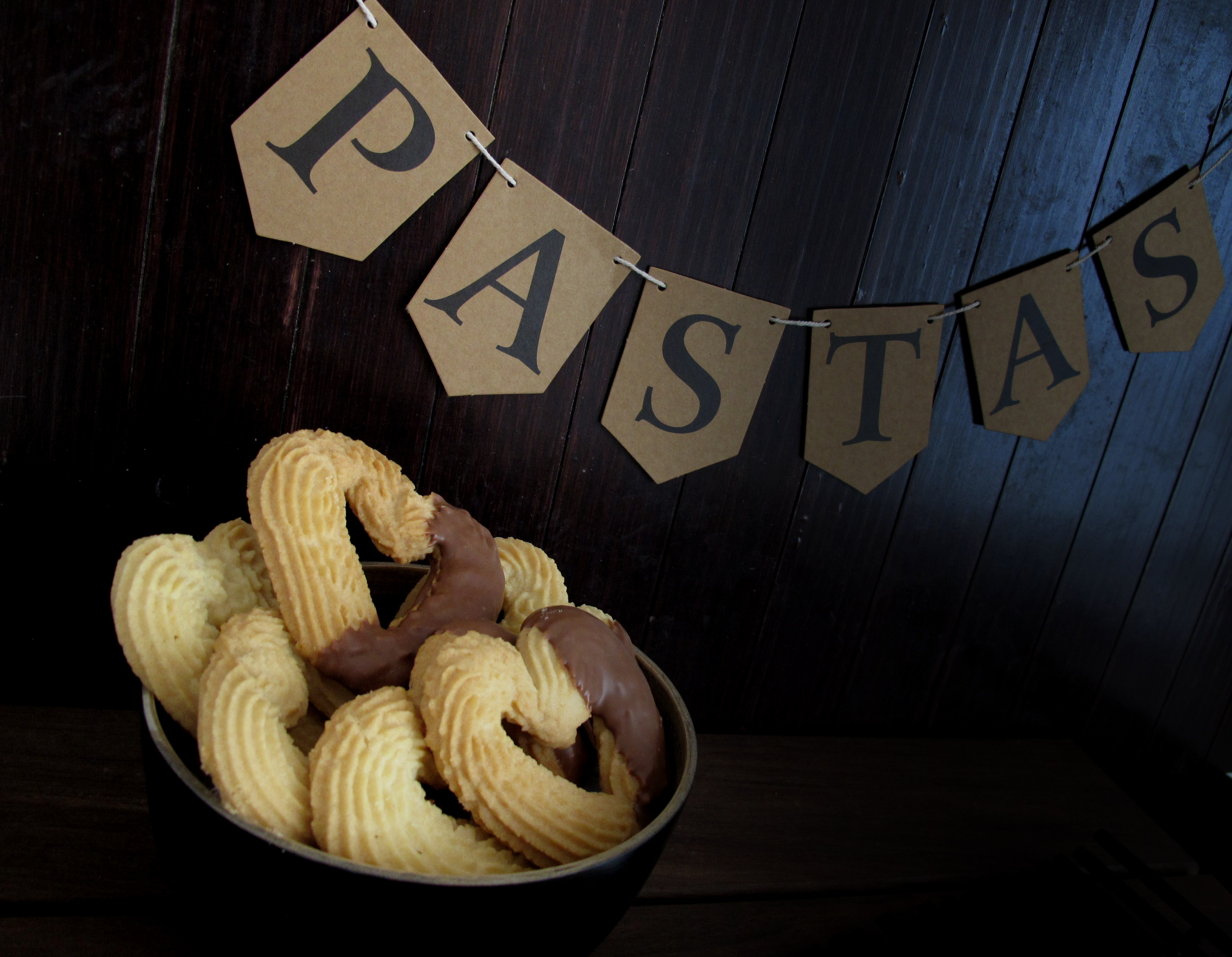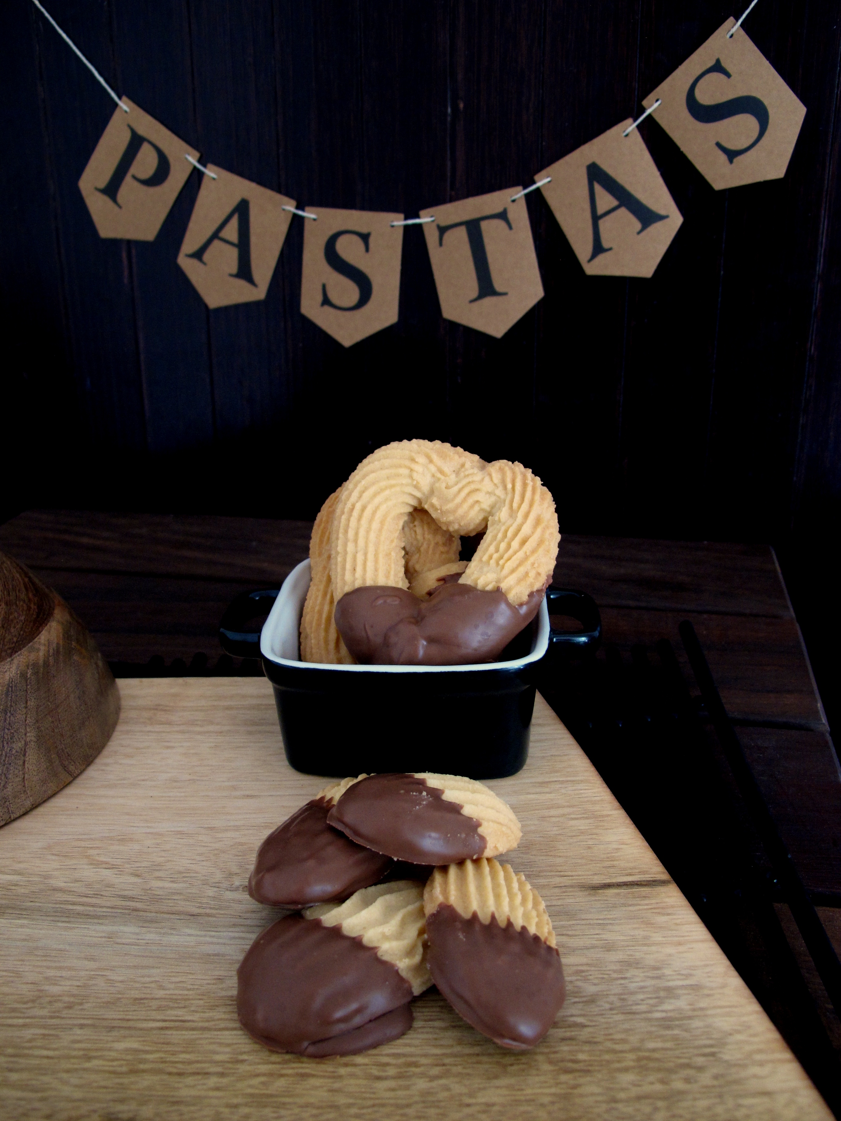 Sólo tenemos que fundir el chocolate en un bol ancho y dejarlo enfriar hasta que se temple. Yo lo fundo siempre al micro a máxima potencia pero en intervalos de un minuto, removiendo entre tanta y tanta hasta que está completamente derretido.Vamos bañando las pastas una a una, dejándolas secar sobre un papel vegetal. ¡¡Mucho cuidado!! porque recién hechas están supertiernas y alguna del peso del chocolate se me partió.