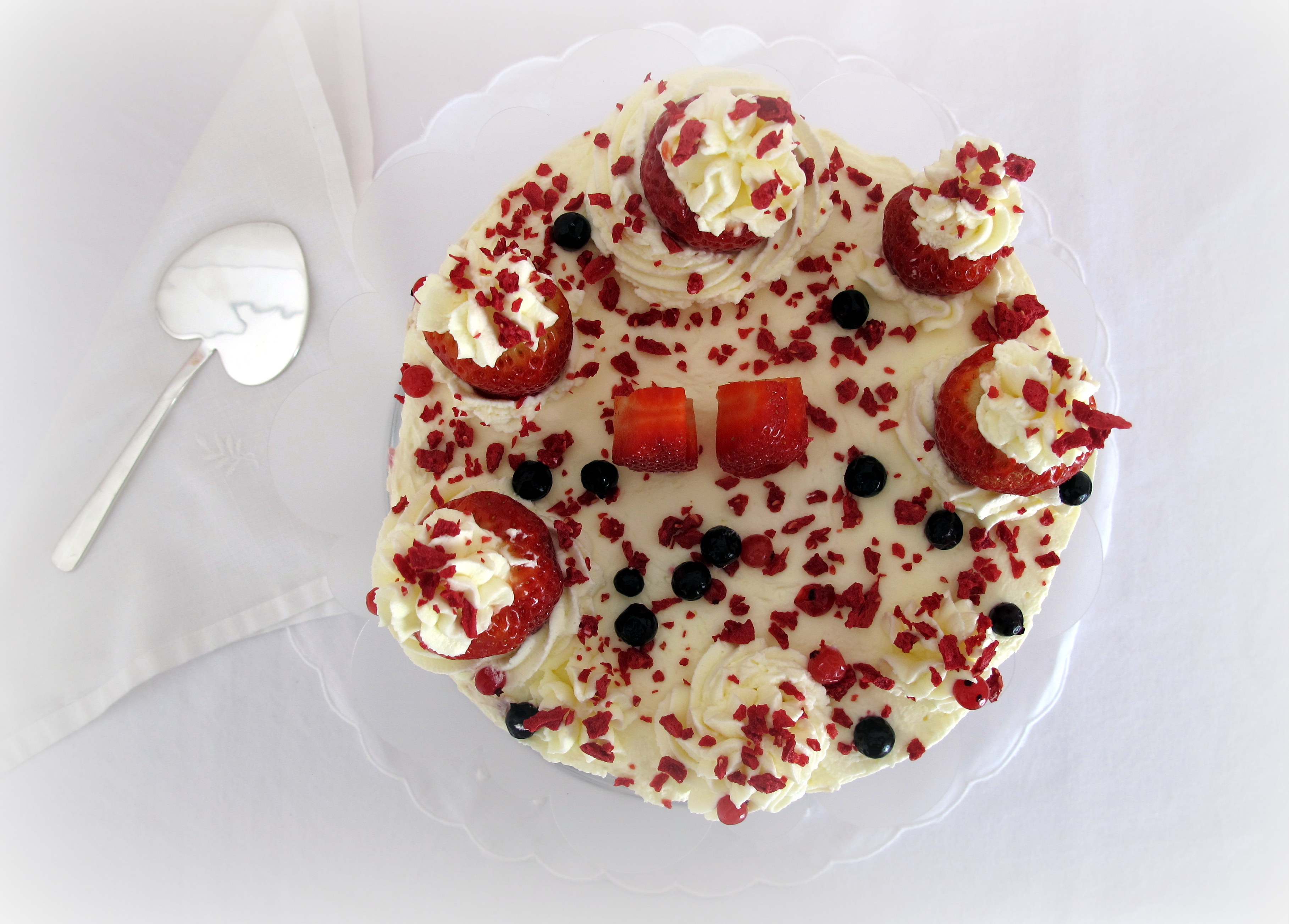 Sacamos y desmoldamos con cuidado. Luego un poco antes de servir la tarta, decoramos con la manga y una boquilla de estrella con la misma crema de nata que habremos guardado en un tupper en la nevera, haciendo montoncitos para colocar las fresas encima.