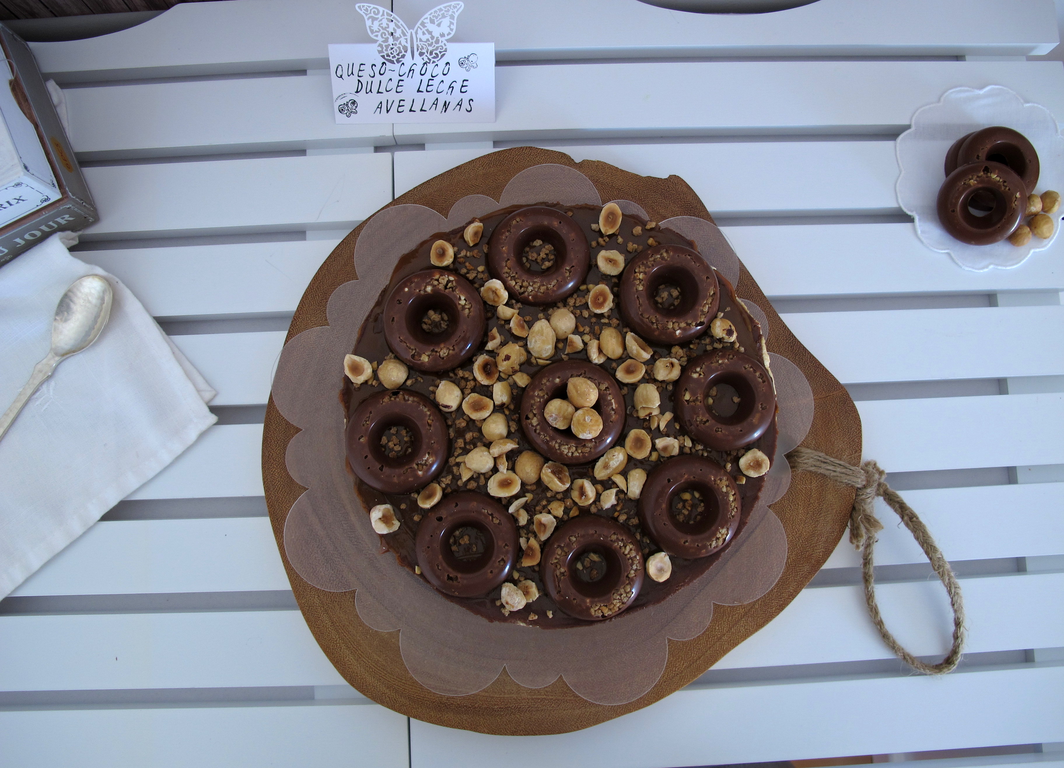 Nada más sacarla de la nevera la desmoldamos , que con el frío será más sencillo. Cubrimos la tarta con dulce de leche al gusto y le echamos por encima avellanas troceadas. Yo le añadí unos rosquitos de chocolate con crocante de avellanas que hice en unos moldes de silicona.