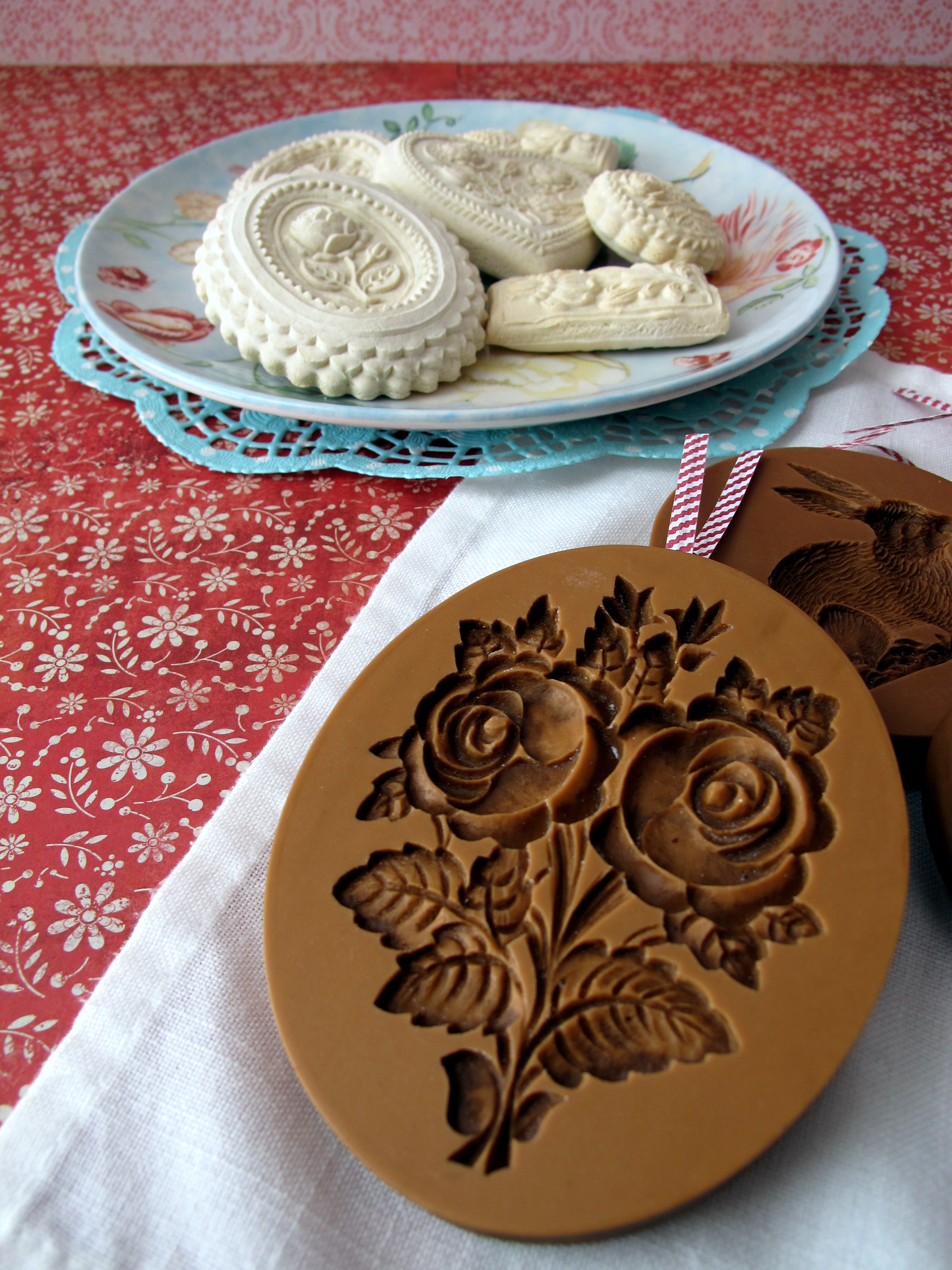 Lo único que vais a necesitar, que se sale un poco de lo normal, es carbonato de amonio, que se evaporará durante el horneado. Pero en cualquier tienda de repostería lo podéis encontrar. Luego tenéis que haceros con un molde especial de galleta springerle, que aunque son bastante caros duran casi eternamente…… y son tan bonitos….Los tenéis de las formas y dibujos más diversos y también los podéis utilizar para dar relieve a vuestro fondant. Está hechos de resina aunque originariamente eran de madera y tallados a mano.