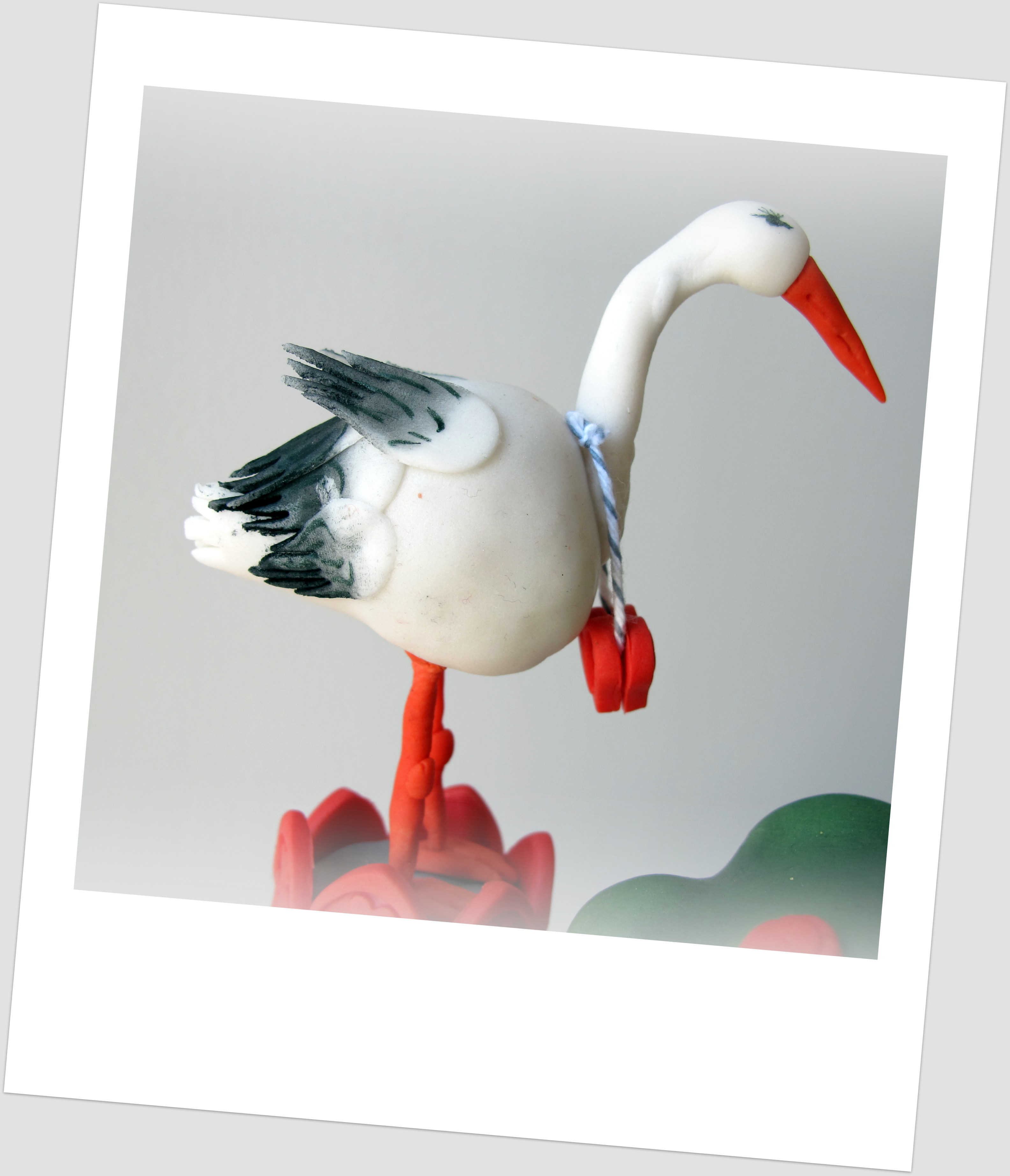Como las figuras son bastantes altas las descargué de peso haciendo algunos interiores con «porespán». Para el cuerpo de la cigüeña utilicé un bolita esférica y para la copa del árbol otra mayor, aunque la corté por la mitad para conseguir una semiesfera. El interior de la torre también es un cilindro forrado de fondant.