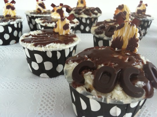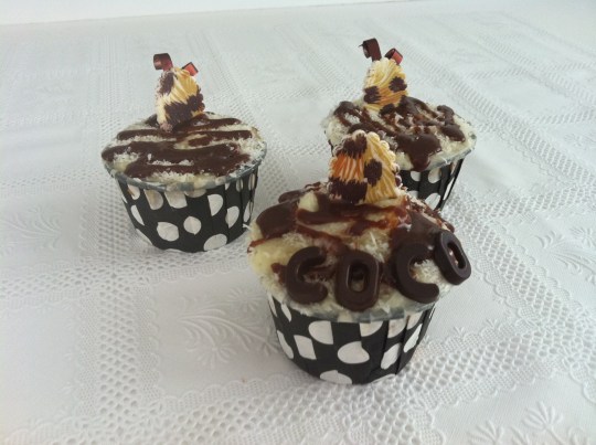 Para decorar lo extendí con un cuchillo sobre el cupcake sin manga ni nada. Luego coco rallado por encima y chocolate derretido que metí en un biberón para ponerlo por encima del cupcake.
