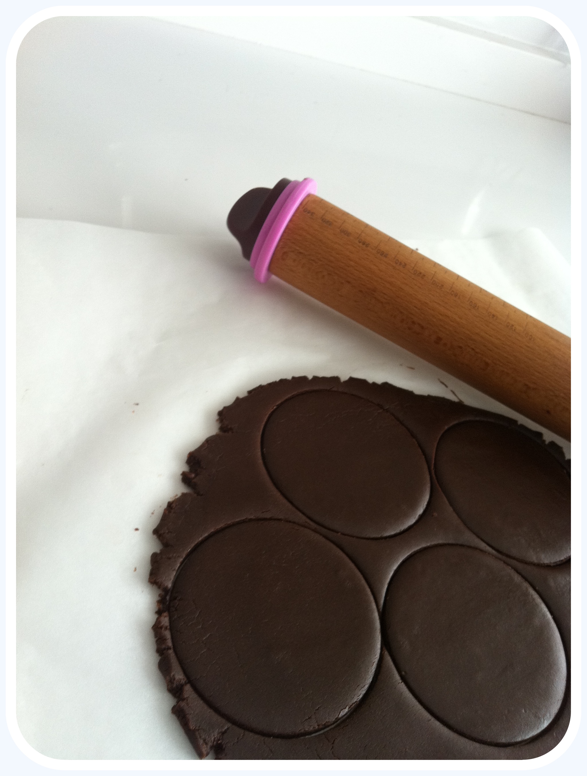 Con un rodillo (con la masa manejable pero aún fría) la extendemos sobre papel vegetal. Yo utilizo un rodillo con alturas porque nos ayuda a que la galleta se haga igual por todos los sitios y queden lo más igualadas posible. Las dejo a 6 mms de grosor porque luego las suelo decorar con glasa. Si no las decoráis con glasa o bien las decoráis con fondant podéis dejarlas más finitas.
