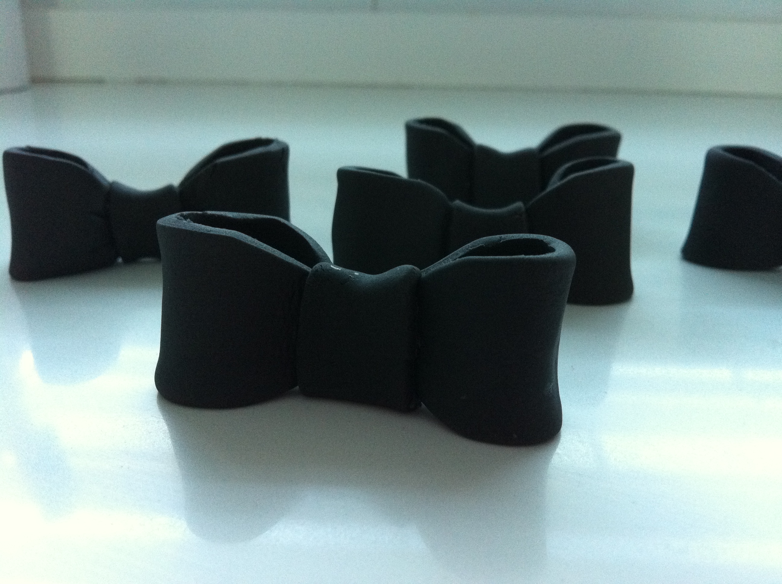 Para hacer los lazos utilicé fondant negro y unos cortadores específicos para lazos.Uno con forma de óvalo que utilizaremos para hacer las dos lazadas laterales,  uno con forma de rectágulo con el que uniremos las dos lazadas anteriores envolviéndolas  y por último uno alargado con «lengua bífida» con que haremos los lazos que caen.