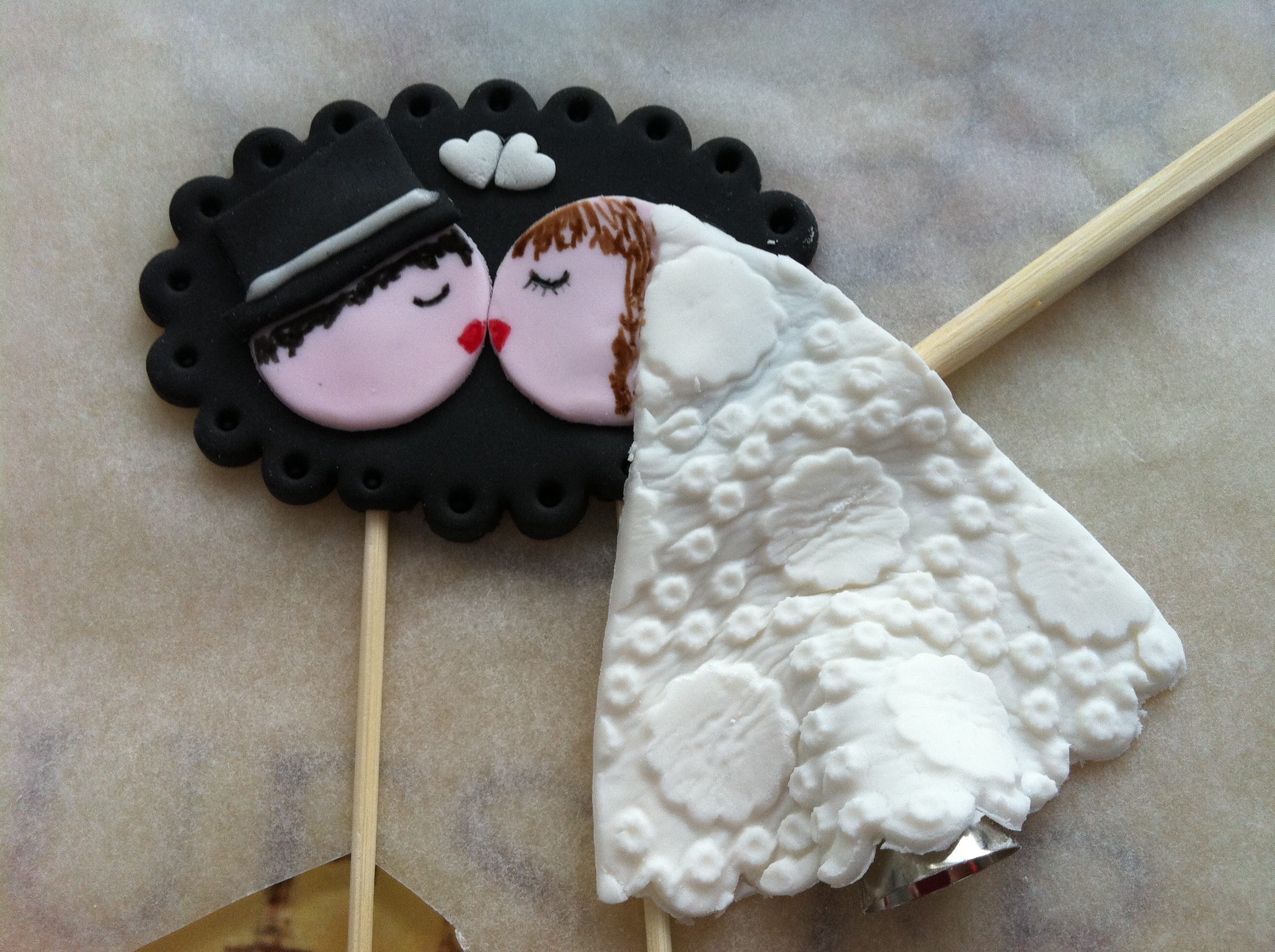 Abajo tenemos a los novios, que  hice con fondant colcándolos sobre un medallón ovalado que pinche con dos brochetas de pincho moruno, para luego poderlos colocar sobre la tarta. Pelos, ojos y boca están hechos con rotulador comestible. Al velo le dí relieve con un texturizador. Aquí los tenemos  en el proceso de secado. Metí una boquilla debajo del velo para que se quedara la forma una vez ya seco.