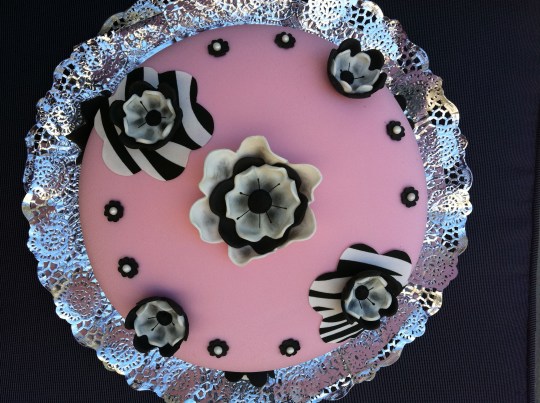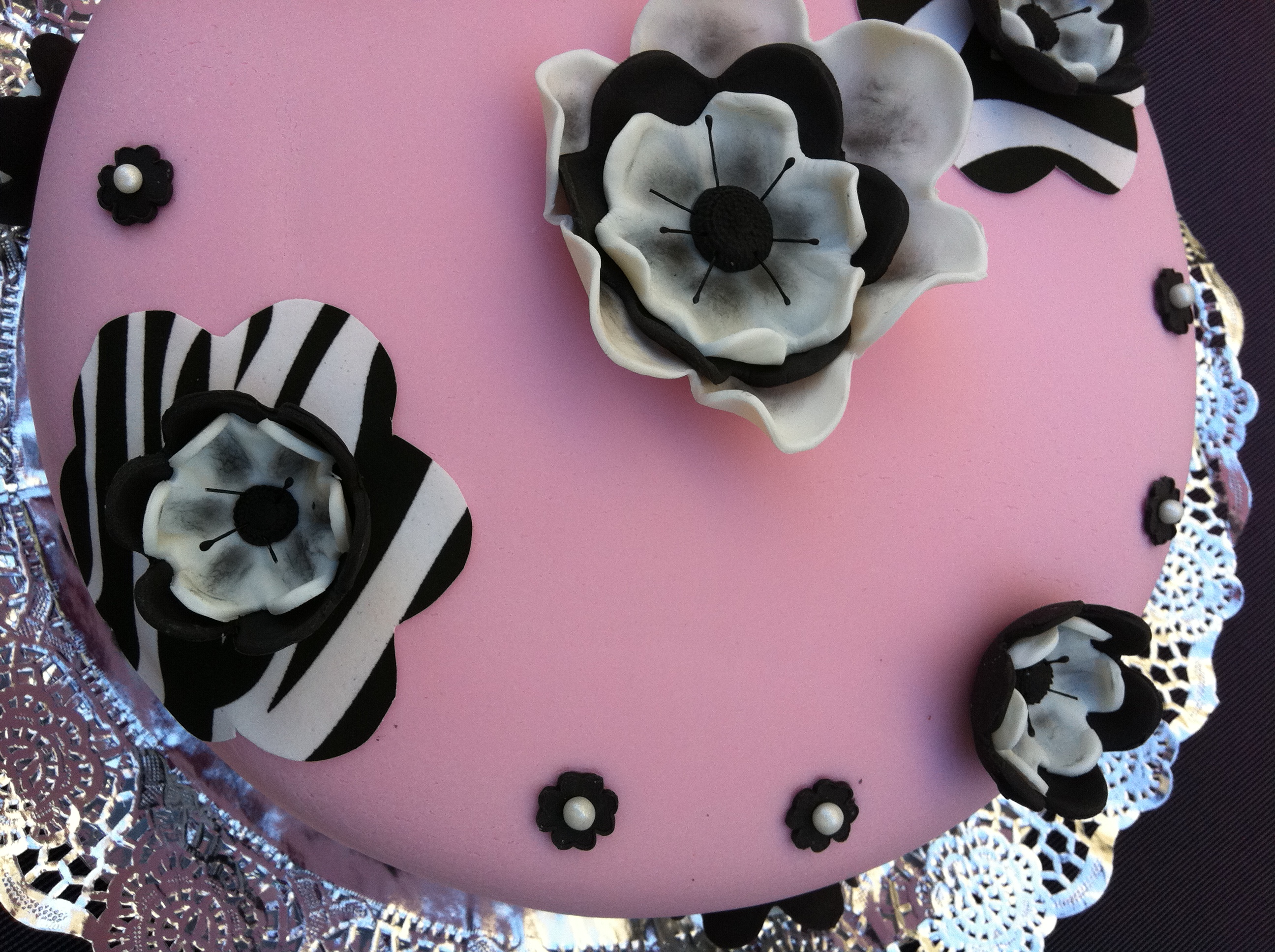 Las flores están hechas con fondant blanco y negro. Las grandes tomaron la forma dejándolas secar en una huevera. Están rematadas con pintura en polvo comestible negra aplicada con un pincel finito.